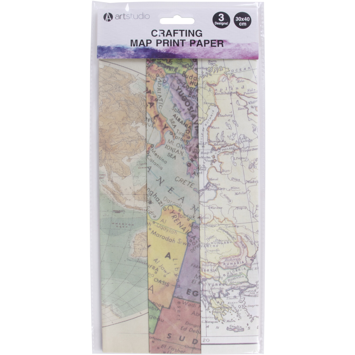 Great for those who love travel or geography, this Art Studio Crafting Map Print Paper makes a wonderful addition to your papercraft project. Perfect for decoupage, scrapbooking and more, there are three designs included in this versatile set.