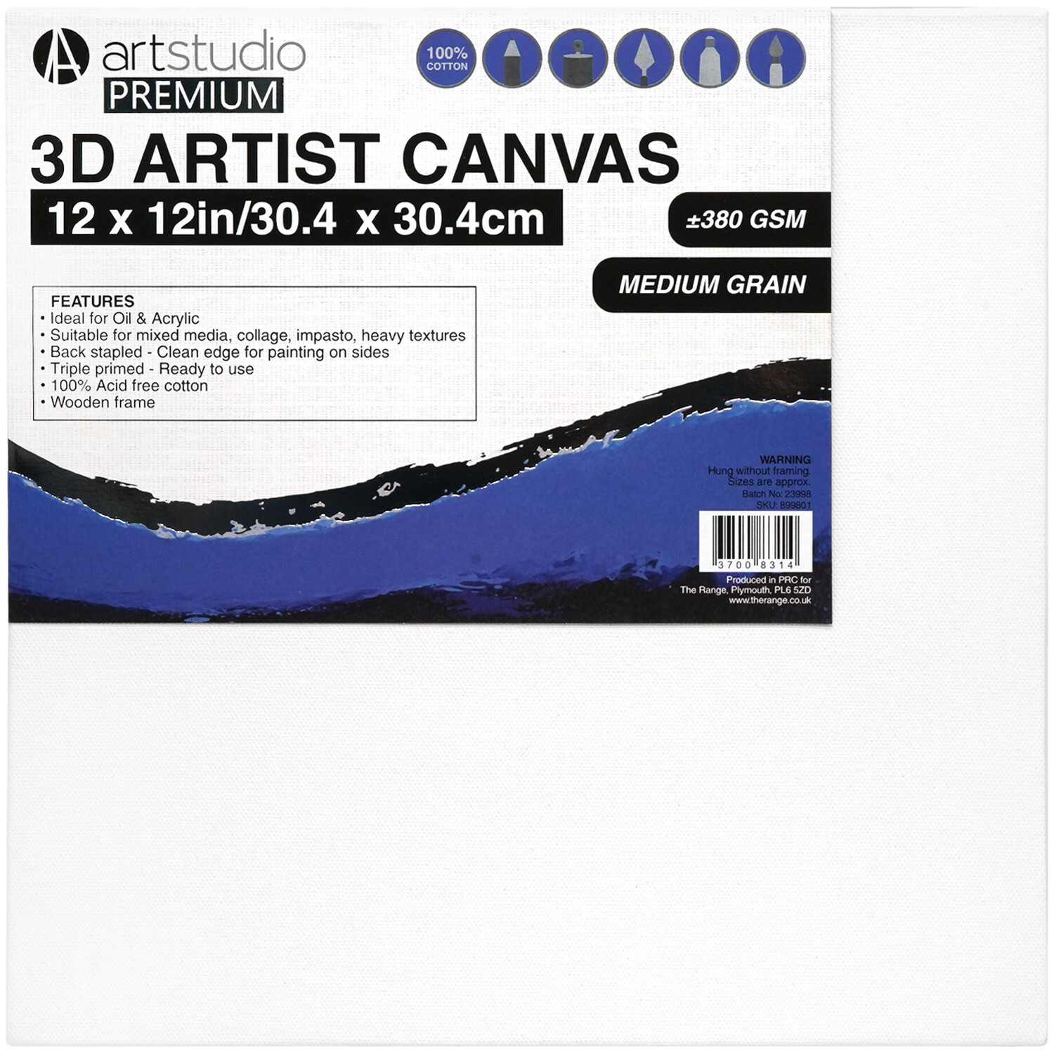 Made from 100% acid free cotton, the Art Studio 3D Artist Canvas is triple primed and ready to use. They are perfect for oil and acrylic paints, mixed medias and other heavy textures. Back stapled to provide a clean edge for painting on the side, this canvas is perfect for students, professionals and hobbyists.