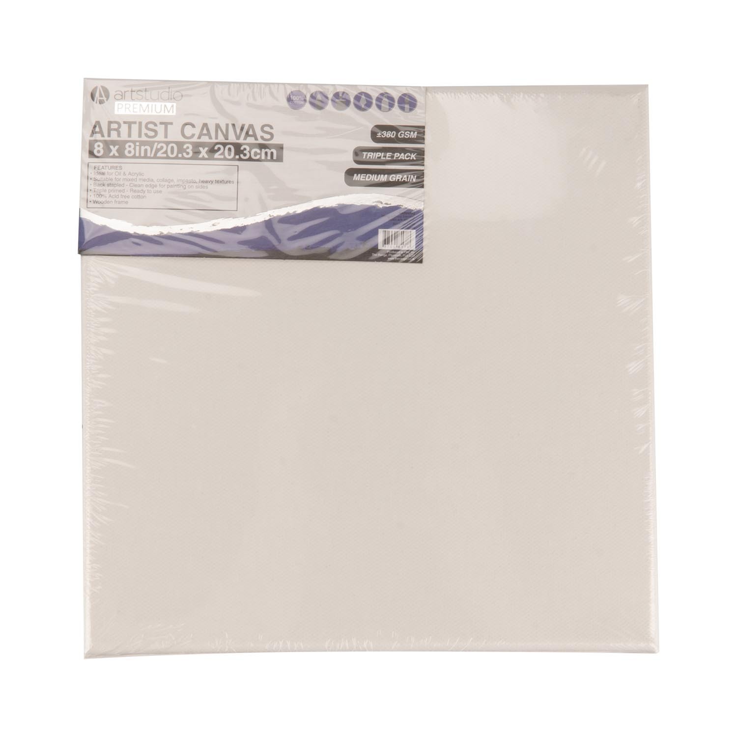 This Pack of Three Art Studio Premium Artists Canvases are perfect for professionals and novices alike. Triple primed and ready to use, these canvases are excellent for oil and acrylic paints, mixed media and other heavy textures. These canvases are also back stapled to provide a clean edge for painting on the side.