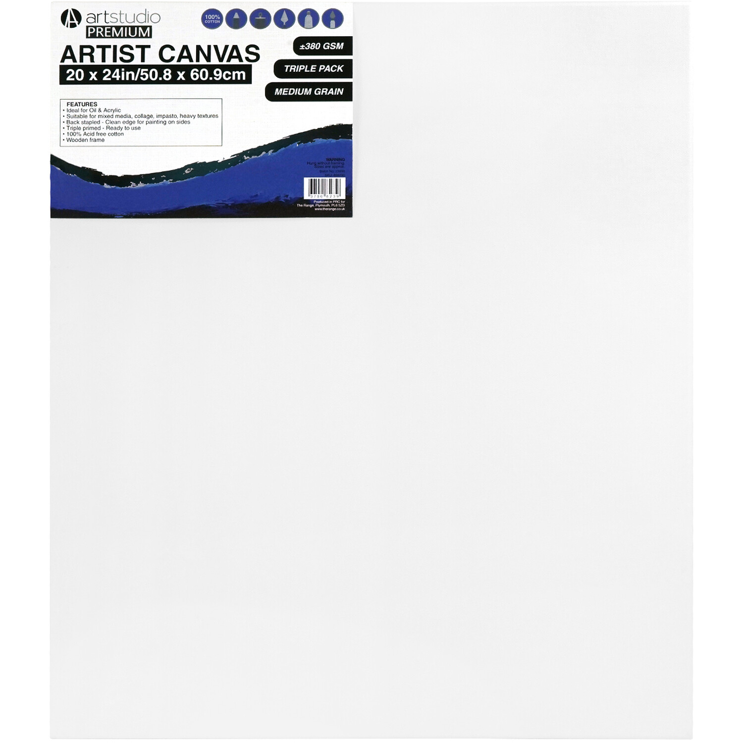 This Pack of Three Art Studio Premium Artists Canvases are perfect for professionals and novices alike. Triple primed and ready to use, these canvases are excellent for oil and acrylic paints, mixed media and other heavy textures. These canvases are also back stapled to provide a clean edge for painting on the side.