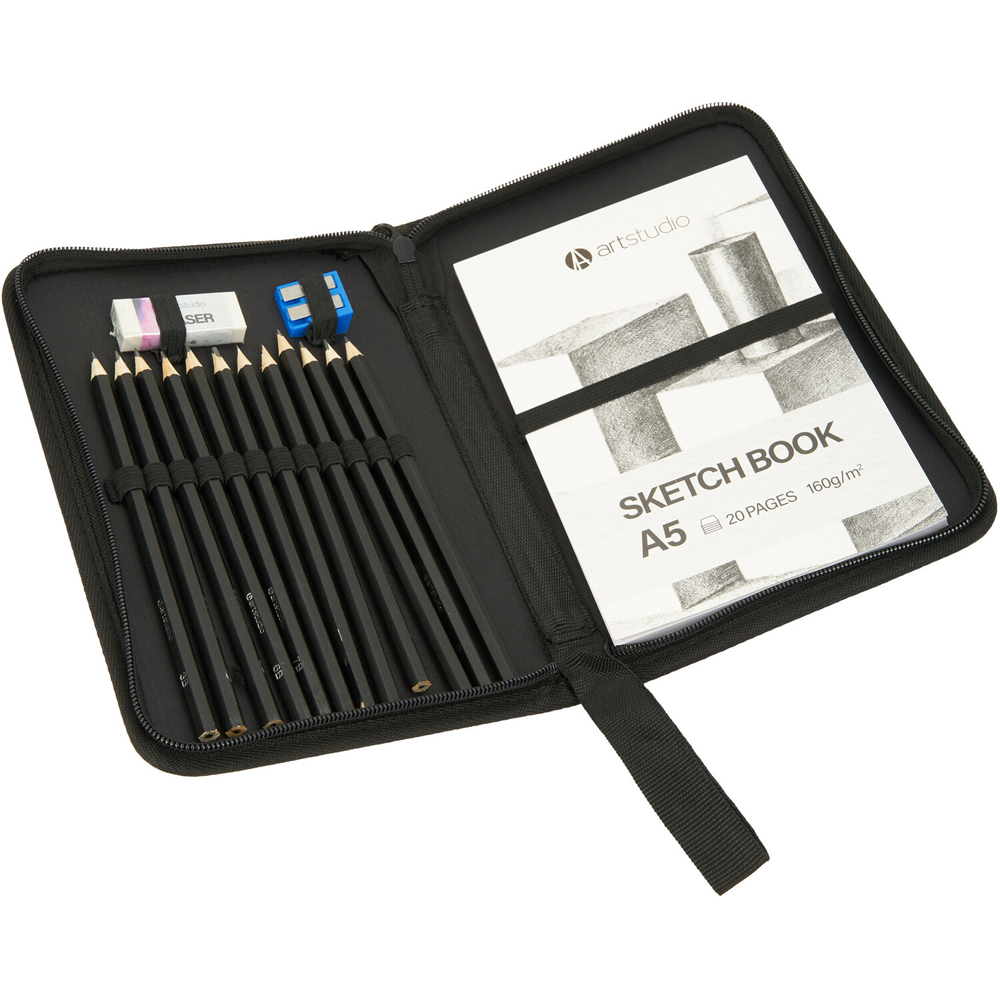 Create a masterpiece using this Art Studio Essential Sketch Set. This 15-piece set includes a 20-page A5 notebook, sharpener, eraser and other essentials in a portable carry case. Offering everything you need to start sketching, this set makes a thoughtful gift for any budding artist.