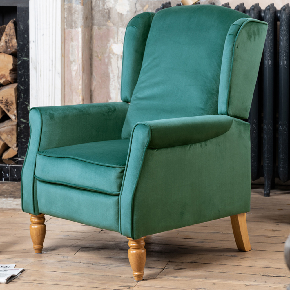 Elevate your living space with the Artemis Home Barksdale Green Manual Recliner Armchair. This manually operated recliner chair effortlessly combines timeless elegance with contemporary functionality, boasting a traditional wingback design that adds a touch of sophistication to any room. The chair, upholstered in a sumptuously soft velvet fabric, invites you to indulge in luxurious comfort, making it the perfect retreat after a long day. Crafted from a solid, hard wooden frame and featuring a versatile design, the chair ensures durability and stability, promising a long-lasting addition to your home. The strong metal recline mechanism allows for a smooth and effortless transition to your preferred reclining position. With no set recline positions, you have the freedom to find the perfect angle that suits your comfort needs. It comes supplied with both light and dark wooden legs, allowing you to customise the chair to blend with your interior aesthetic. Quick and efficient delivery service, ensuring that the armchair arrives promptly and ready to become the focal point of your relaxation space.