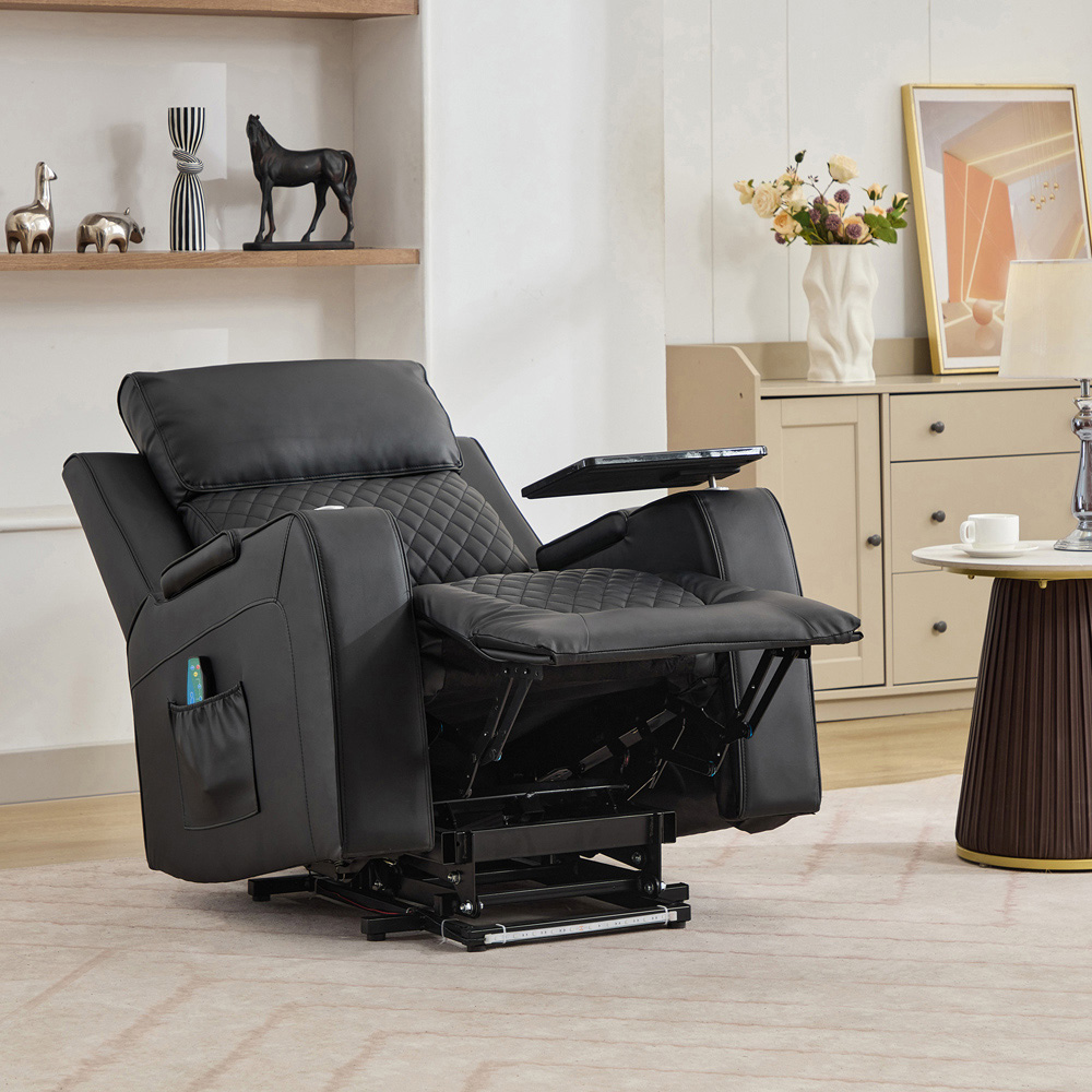 Experience the ultimate in comfort and convenience with the Byron Electric Lift-Assist Riser Recliner, designed to provide effortless relaxation and support. This electrically operated riser recliner gently assists you to a standing position, making it ideal for those with mobility needs. Upholstered in durable bonded leather, with faux leather in low-stress areas for added longevity, it combines style with practicality. Enjoy integrated massage and heat functions for soothing relief, while the reversible table attachment ensures versatility, fitting on either side to suit your space. Stay organised with under-armrest storage, keep your favourite drink chilled in the built-in cooler on the left-hand arm, and set the perfect ambience with LED lights on the chair's underside. The Byron recliner is the perfect blend of luxury, functionality, and modern innovation.