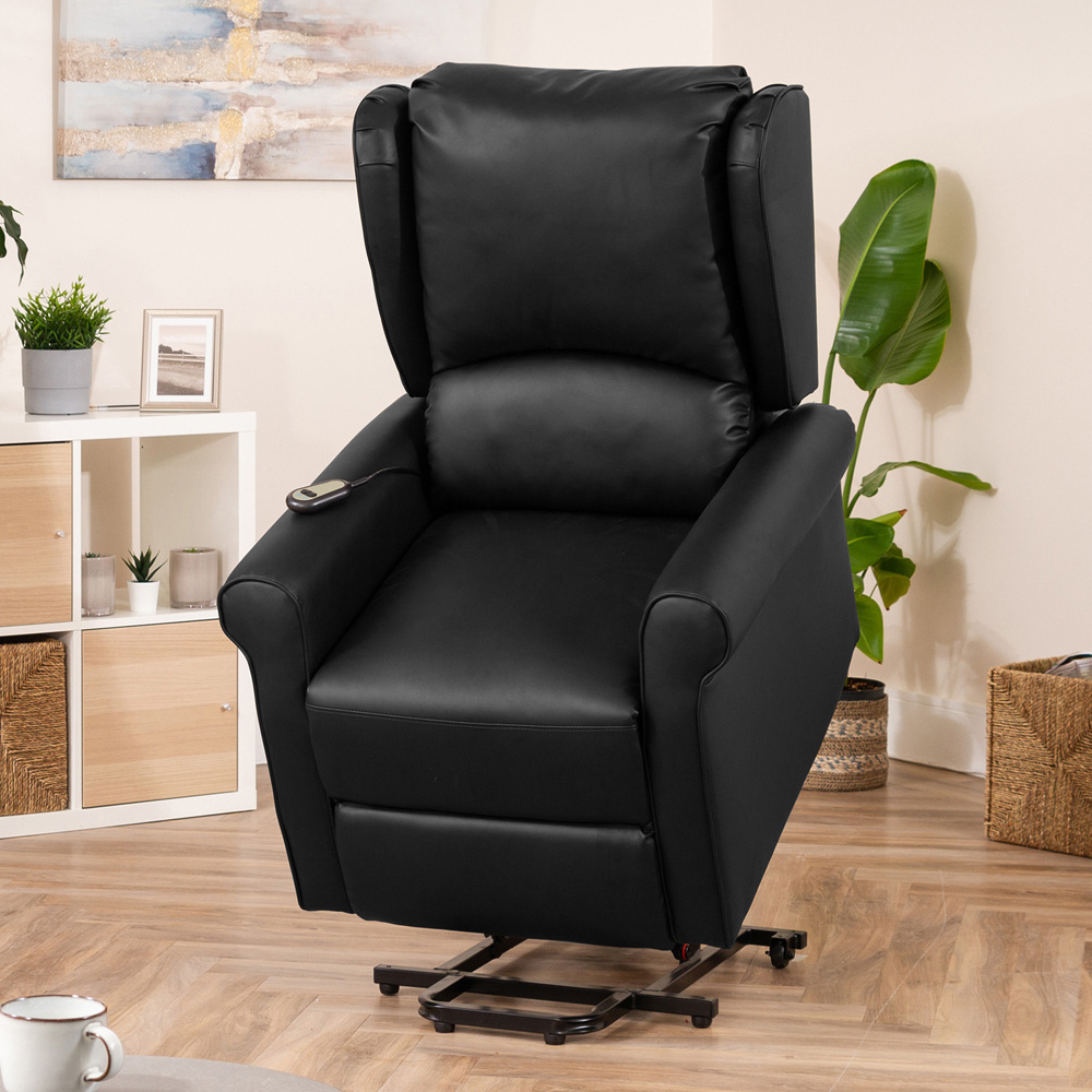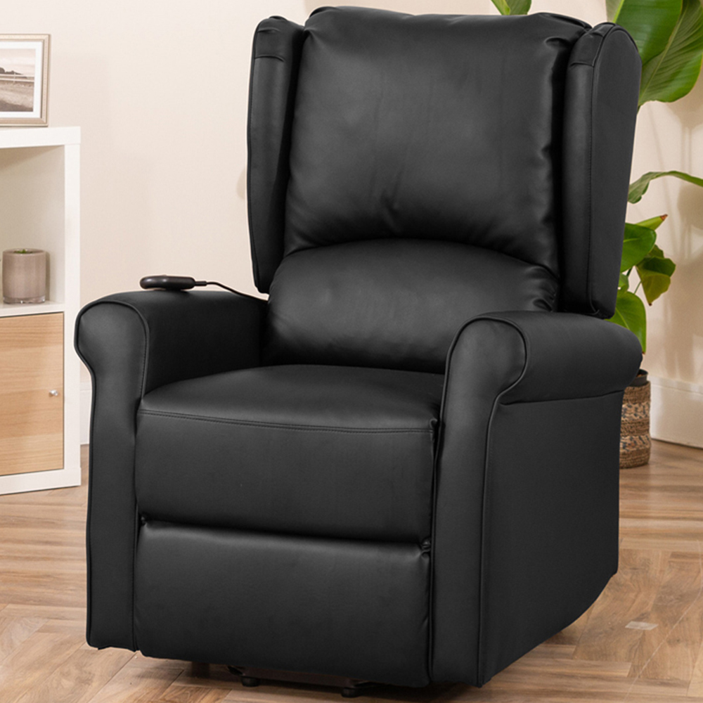 Welcome superior comfort into your abode with the Artemis Home Corcoran Black Massage and Heat Electric Recliner Chair, a stylish and comfortable electric rise and recline chair designed to make your relaxation time even more luxurious. Upholstered in durable bonded leather, this high-backed chair features integrated massage and heat functions, making it the perfect choice for those looking to improve mobility or unwind after a long day. Crafted with a sturdy wooden frame and a reliable recline mechanism, the chair can support up to 130kg of weight. Its electrically operated rise and recline functions can be easily paused at your preferred position, while the massage points in the seat, lower and upper back, along with the warming heat function in the lumbar area, provide targeted relief. Plus, with a hassle-free two-man delivery service, the chair will be brought to your room of choice and expertly installed for your convenience.