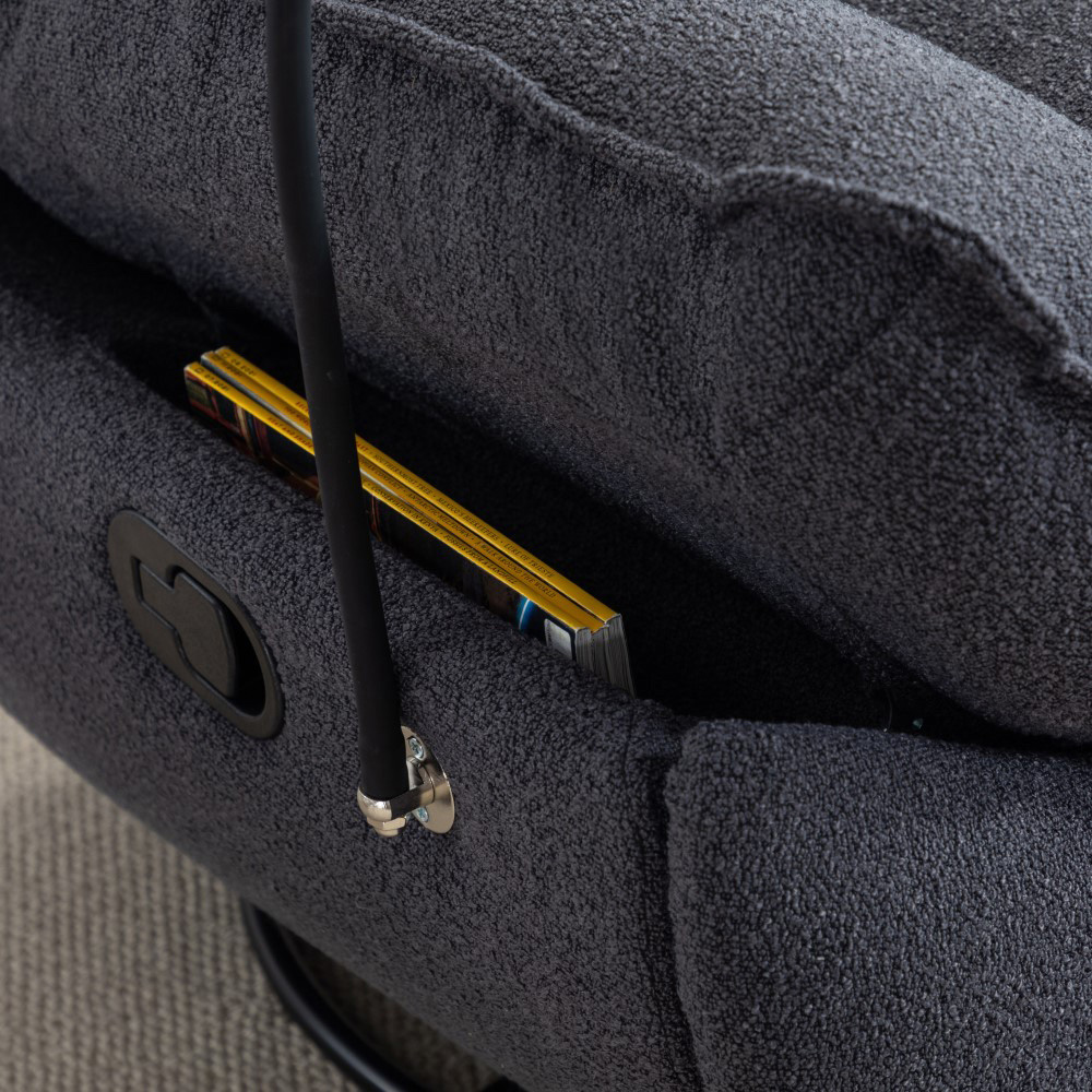 Enhance your days of rest and relaxation with the Artemis Home Fallon Dark Grey Boucle Swivel Manual Recliner Chair. This swivel-based recliner has soft and spacious coil-sprung foam seating that is upholstered with beautiful high-quality boucle fabric, giving it a luxurious feel. The built-in phone holder is an added advantage, giving you ease of access and allowing you to read e-books and use your phone with minimal hassle. The wooden frame provides sturdiness and durability. This chair is ideal for making a style statement all while being wrapped in utter comfort and luxury. We provide an efficient delivery and assembly service to ensure a convenient and hassle-free setup.