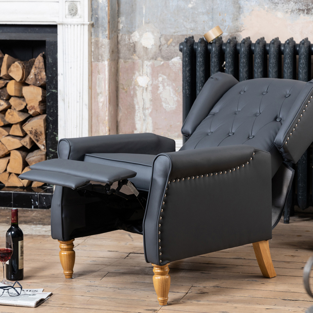 Sink yourself into soft and inviting comfort with the Artemis Home Galena Grey Manual Recliner Chair, a fusion of elegance and comfort in the form of a sleek, manually operated push-back recliner. This chair combines classic design elements with modern convenience, featuring a traditional wingback silhouette that exudes timeless charm. The studded back adds a touch of sophistication, making the chair a stylish statement piece for any living space. Its upholstery consists of durable bonded leather, with faux leather strategically incorporated in low-stress areas, ensuring both a luxurious look and exceptional longevity. The chair's solid, hard wooden frame construction guarantees sturdiness and stability, making it a reliable and long-lasting addition to your home. Its strong metal recline mechanism provides a smooth and effortless transition to your preferred reclining position, offering a personalized relaxation experience. With its flexible recline feature and no set recline positions, you can easily find the perfect angle for your comfort. Furthermore, the chair comes with both light and dark wooden legs, giving you the flexibility to match the chair seamlessly with your interior decor.