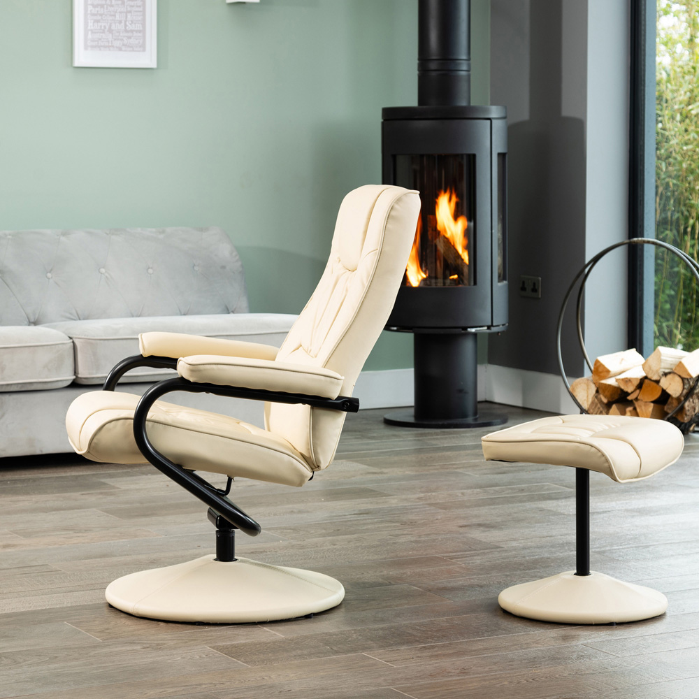 Elevate your lounging experience with the Artemis Home Gibson Cream Swivel Recliner Chair with Footstool. Featuring a full 360-degree swivel function, this chair offers unparalleled flexibility, allowing you to effortlessly pivot and turn in any direction. The push-back recline function provides seamless adjustment to your desired angle, ensuring maximum comfort at all times. Crafted with durable bonded leather, the set exudes timeless sophistication while effortlessly withstanding everyday use. The clever use of faux leather in low-stress areas creates a luxurious look and feel without compromising on quality or affordability. Built with a robust metal frame, the set offers unwavering support and stability. The plush foam seat interior guarantees lavish cushioning, creating an inviting and comfortable spot to unwind after a long day. Experience the joy of owning this set with quick and efficient delivery, allowing you to transform your space into a haven of relaxation without delay.