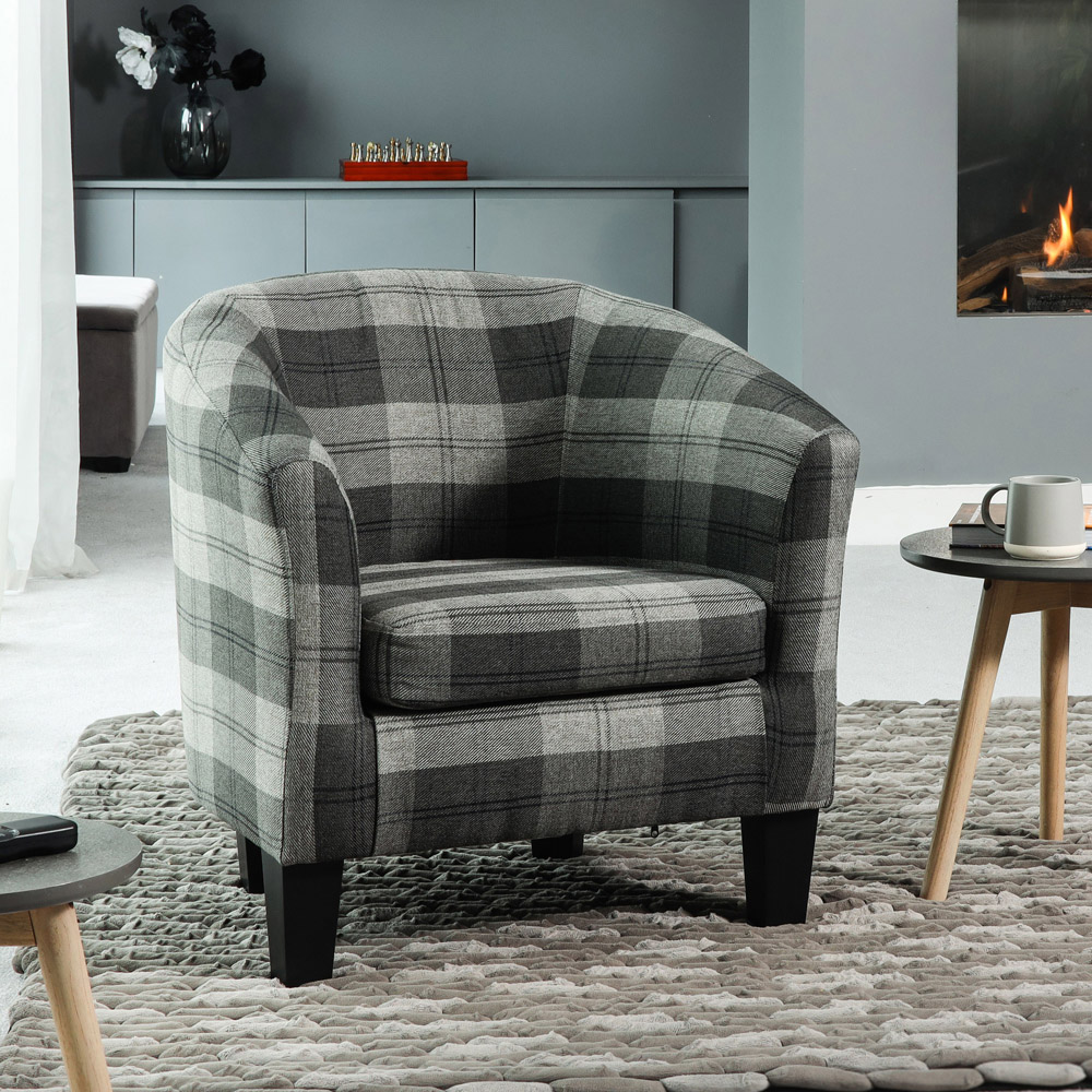 Add style and comfort to your space with this Artemis Home Medford Grey Tub Chair. This chair is an ideal choice if you're looking for occasional seating with a classic design. It features a firm removable seat cushion and rounded arms for added comfort. The chair is constructed from solid hardwood and is foam-covered for an extra layer of comfort. It is upholstered in a beautiful chequered fabric and comes with both light and dark wooden legs, allowing you to customise the appearance to match your decor perfectly.