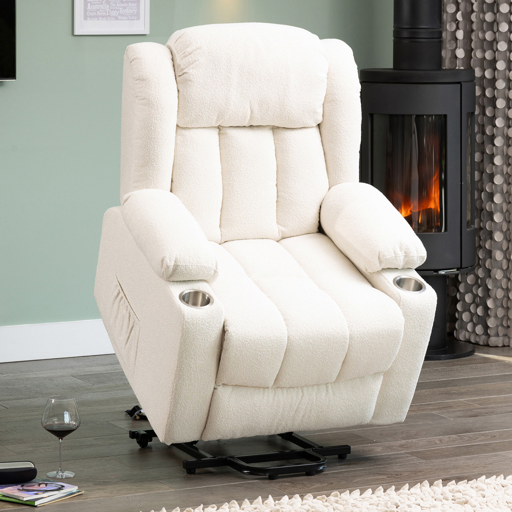 The Redding Dual Motor Electric Lift Assist Recliner Chair with Massage and Heat offers exceptional comfort and convenience, perfect for those seeking style and support. This electrically operated lift-assist riser recliner features a dual motor function, allowing independent adjustment of the backrest and footrest for personalised comfort. Upholstered in a textured boucle fabric, it combines luxurious softness with modern appeal. Built with a solid, hard wooden frame and featuring a foam and sprung interior, it ensures lasting durability and superior support. The chair offers a variable recline function with massage points in the seat, lower, and upper back, including targeted lumbar massage for ultimate relaxation. With handy cup holders integrated into the armrests, the Redding Recliner provides everything you need for a comfortable and soothing experience.