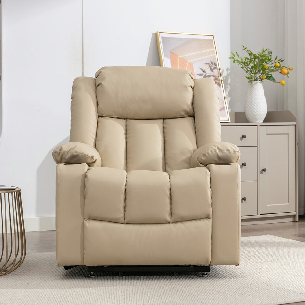 Experience ultimate tranquillity with the Artemis Home Sheridan Cream Massage and Heat Electric Recliner Chair. This exquisite recliner is upholstered using durable bonded leather with a solid construction. It features a cosy coil-sprung and foam-filled seat with a sturdy base for stability and support. It has a dual-motor, electric lift assist riser that makes reclining easy and convenient. This recliner has an integrated heat function in the lumbar area and massage points in the seat, lower and upper back area. It also features built-in cup holders in the armrests with side pocket storage for keeping your essentials. The two-man delivery and assembly service ensure a seamless setup, so you can relax while enjoying its comfort.