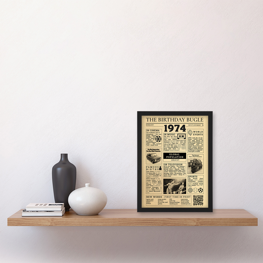 Step back in time and celebrate a special year with the Artery8 Back in 1974 Birthday Anniversary Newspaper Framed Wall Art Print A4, a captivating piece that adds a touch of nostalgia and elegance to any room. Expertly crafted using advanced printing technology, this artwork boasts vibrant colours, sharp details, and a depth that brings the vintage newspaper design to life. Whether it's enhancing your living room, bedroom, or office, or searching for the perfect gift for a birthday, Mother's Day, or a housewarming, this framed print is sure to impress. The quality wooden frame complements the historical theme, and with pre-attached back fittings, it's ready to hang upon arrival. Please note, colour variations may occur due to screen settings.
