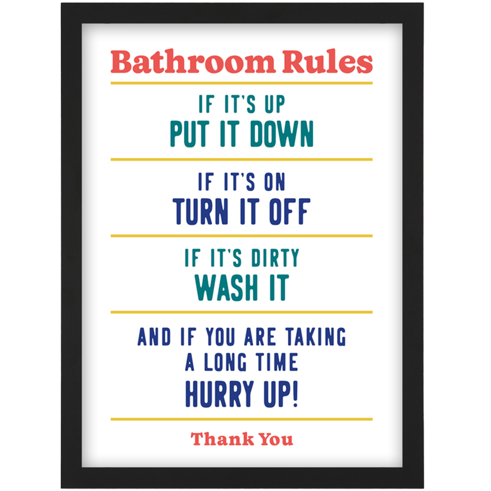 Brighten up your bathroom with a splash of humour using the Artery8 Colourful Funny Bathroom Toilet Rules Sign, elegantly presented in an A4 black frame. This delightful piece combines vibrant colours and playful rules to add a light-hearted touch to any restroom. Crafted with superior materials and the latest printing technology, this wall art ensures sharp, lasting colours and details that pop. The shatterproof styrene glass in the frame guarantees both safety and enduring quality, making it a worry-free addition to your space.