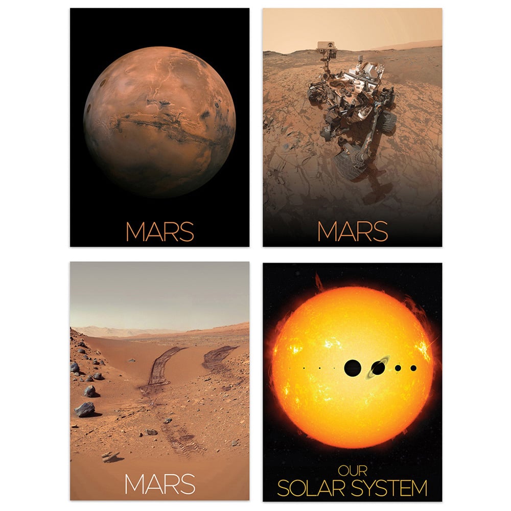 Elevate your space with the 'Set of 4 NASA Our Solar System Sun Mars Curiosity Rover Red Planet Wall Art Prints', a visually striking collection that captures the essence of space exploration. Each 30 x 41 cm print showcases a different aspect of our solar system, from the fiery Sun to the intriguing Mars, depicted through the lens of NASA's Curiosity Rover. Printed on thick, luxurious art paper, these unframed prints are perfect for custom framing and will add a touch of sophistication to any room. Whether you're a space enthusiast or simply appreciate fine art, this set is sure to impress and inspire.