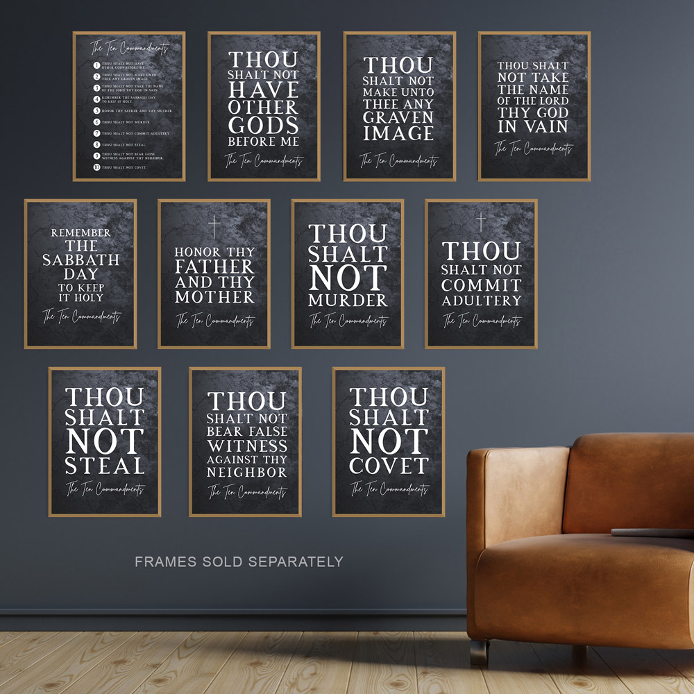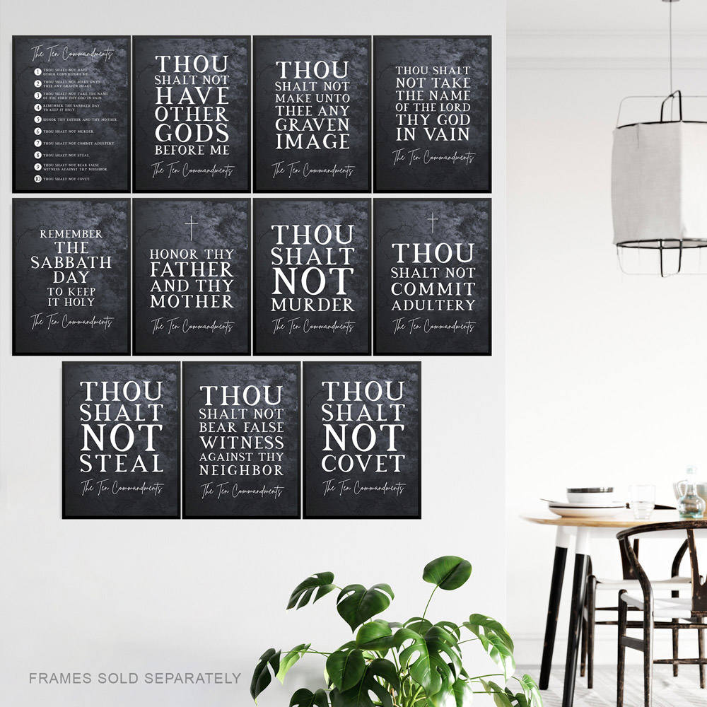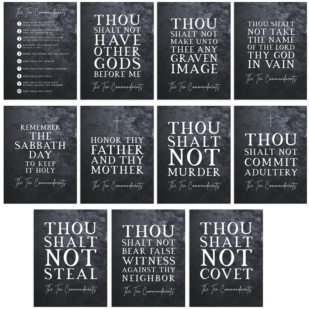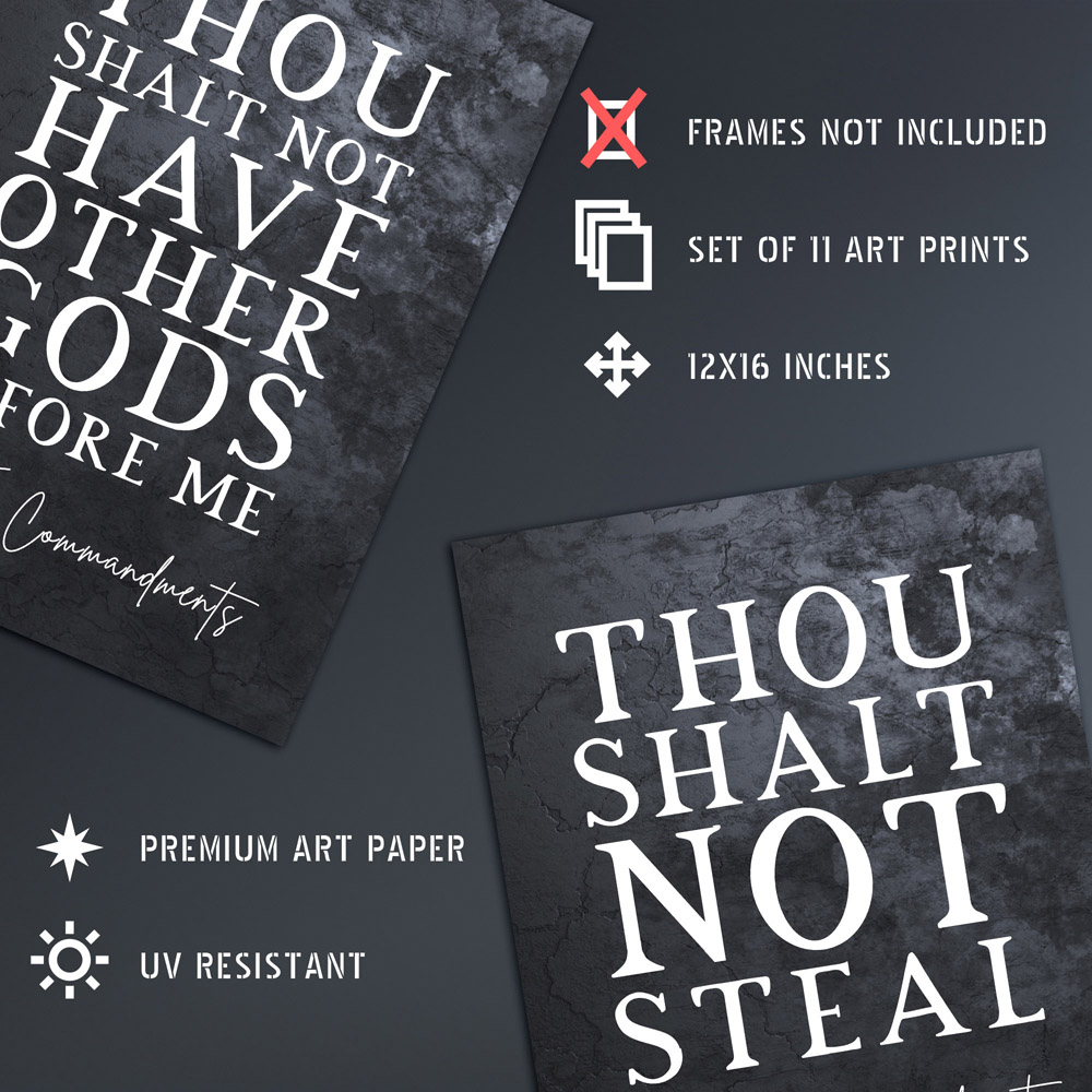 Elevate your space with a touch of divinity using the Pack of 11 The Ten Commandments Bible Quotes Verse Poster Art Prints. This collection offers a series of 11 luxurious, unframed wall art prints, each measuring 30 x 41 cm, that blend seamlessly into any decor style. Printed on thick, high-quality art paper, these prints bring inspirational Bible verses into your home or office. Whether you're looking to inspire, comfort, or simply decorate, these prints are versatile and ready for framing to match your personal style. Please be aware of slight colour variations due to different screen settings.
