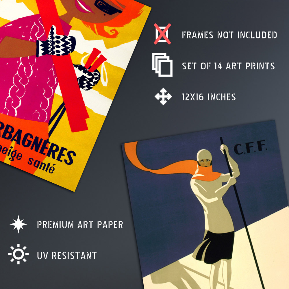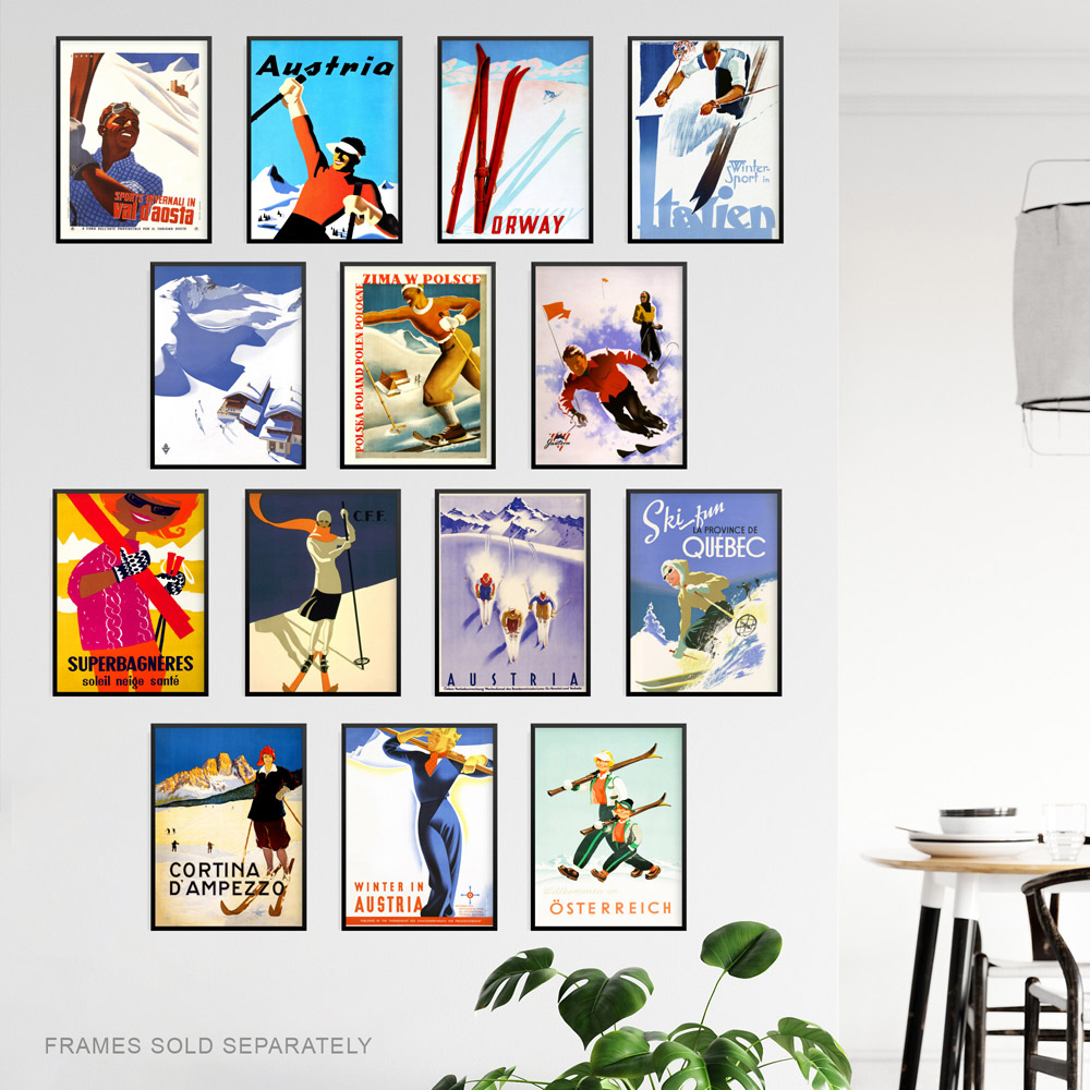 Immerse yourself in the thrill of winter sports with this exquisite pack of 14 Vintage Ski Adverts Wall Art Prints, each depicting vibrant and nostalgic scenes from Austria, Italy, France, and Norway. Measuring 30 x 41 cm, these high-quality, unframed prints bring the golden era of skiing right into your living space. Printed on thick, luxurious art paper, they capture the essence of adventure and elegance, making them a perfect addition to any room looking to enhance its decor with a touch of vintage charm.
