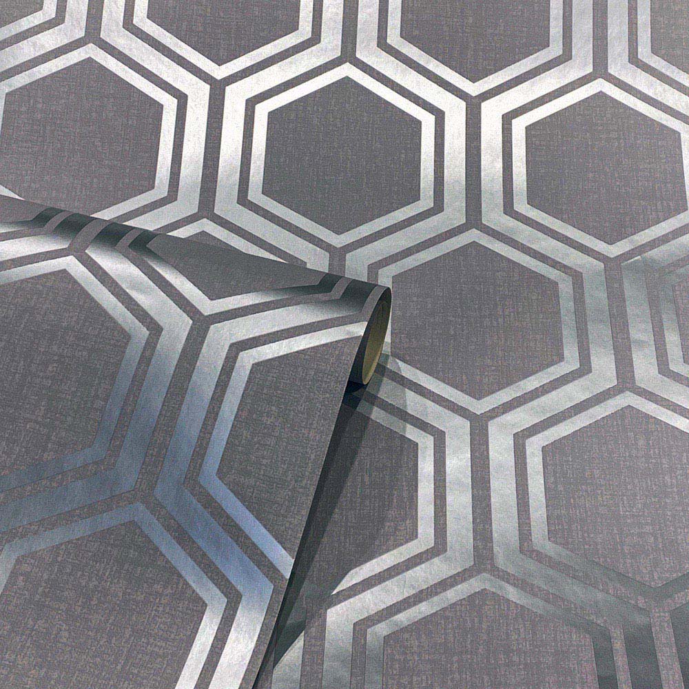 Add depth and texture to a room with Arthouse Luxe Hexagon Gunmetal Silver Wallpaper. Luxurious and striking, the bold graphic hexagon wallpaper is designed to make a strong style statement. Contrasting a dark grey textured finish with a sleek silver pattern, it's a paper that will create impact - as well as reflect daylight or the glow from lamps back into the room. This blown vinyl paper-backed wallpaper will cover imperfections on your walls. Ideal as a feature wallpaper in a lounge or dining room, it also looks the part of a boutique-hotel style bedroom. Suitable for most rooms except high moisture environments, like bathrooms. The wallpaper is washable. Hanging Method: Paste the Paper. Pattern Match: Straight Match. Pattern Repeat: 53cm. Roll length: 10.05, Width: 53.