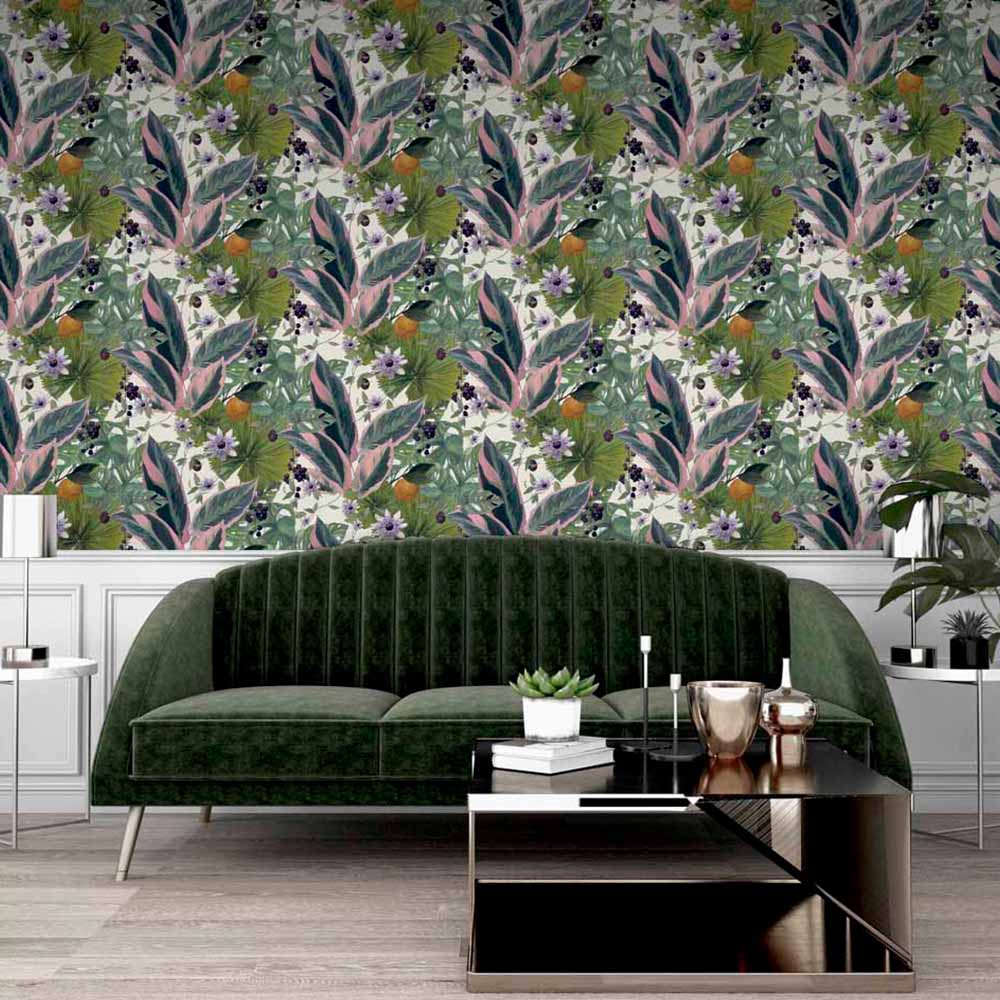 Bring a splash of colour to your walls with this passion flower design wallpaper from Arthouse. The painterly design features bold, large scale exotic foliage intertwined with fruit salad mix and orange blossom groves. The wallpaper includes a mixture of colours, tropical citrus, peachy pinks, and lush lemon yellow on a pastel white background to brighten up the design. This wallpaper is pasted on the wall, making it easy to apply and will provide a high-quality look like a feature wall or equally throughout a whole room.