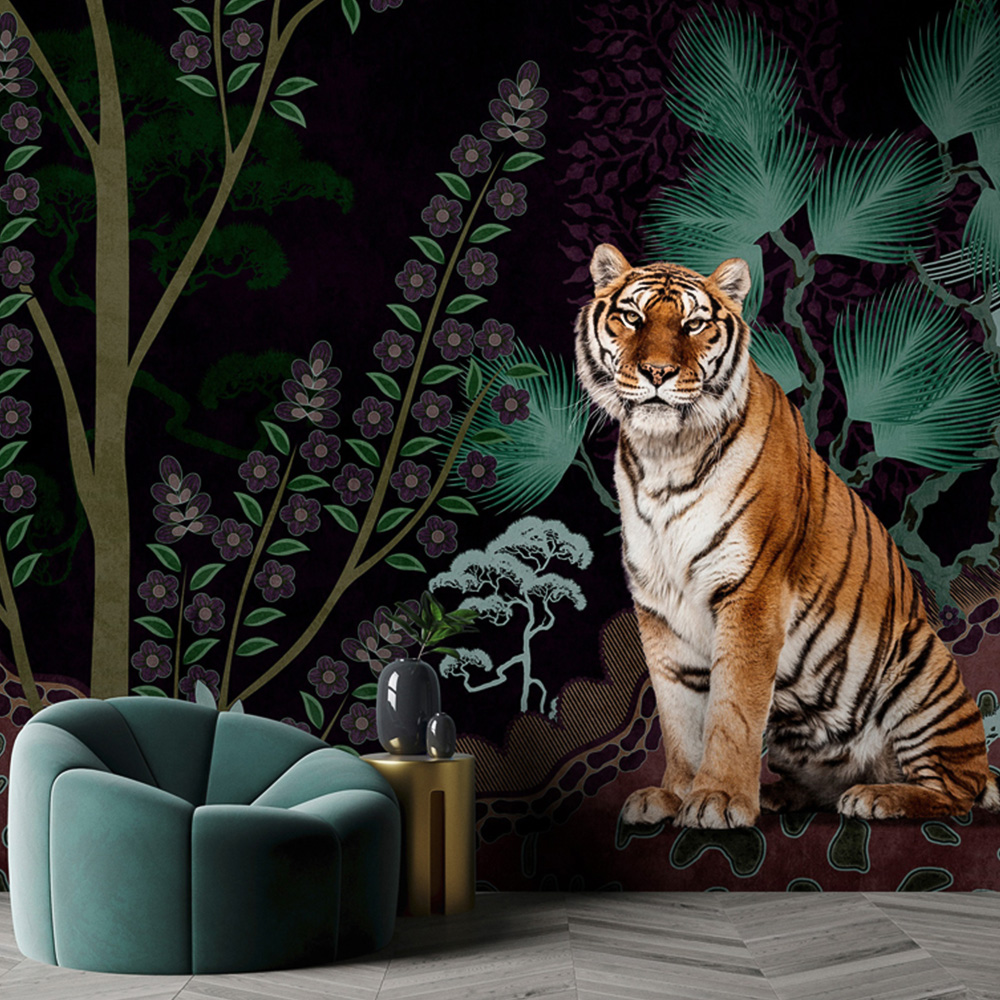 Khan the tiger brings subtle drama to your walls. In dark opulent colours, it’s a real statement design. This wallpaper mural presents a captivating scene of a majestic tiger resting amidst a dark, stylized jungle. The tiger, with its vibrant orange coat and striking black stripes, stands out against a rich, deep background filled with intricate foliage. Surrounding the tiger are lush, graphic depictions of plants, including tall flowering branches and broad tropical leaves, rendered in muted greens, purples, and browns. The design combines natural beauty with a surreal, artistic twist, blending the tiger's realistic presence with the decorative, almost whimsical patterns of the jungle. This mural would make a bold, dramatic statement in any space, evoking the wild elegance of nature. Suitable for Living rooms, offices, bedrooms and hallways. Easy to apply and remove, it's perfect to create an instant design impact in your room. Size: 400 x 270cm.