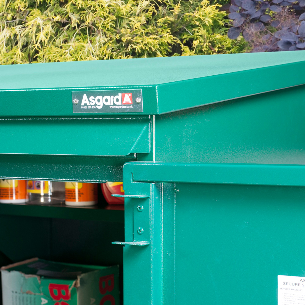 The Asgard Annexe is a 100% British-made, Secured By Design, Locksmith Approved and Insurance Approved (Police Preferred Specification) secure bike shed, providing secure storage for all of your bikes and equipment (up to 3 bikes). Featuring amazing, theft-resistant, pick and drill-resistant locks, reinforced doors, stainless steel (welded on) hinges and heavy duty panels, this approved bike shed offers superior, professional-level security and is the ideal (one-stop) secure store for all bike equipment. The Annexe shed is constructed from our thick, galvanised (weatherproof) steel panels and features an integral metal floor and convenient large double door access (which you can hand for Left or Right opening). It includes a rain guard above the door to keep the drips off your feet. Internal fixings and a five-point deadbolt locking system add even more security and peace of mind. This fully ventilated bike storage shed has been designed to minimise condensation thanks to the integral ventilation system, helping to maintain internal air flow while remaining secure.