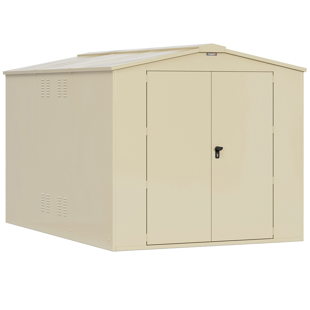 The Asgard Gladiator 7 x 11 Motorcycle Shed is a 100% British-made, Secured by Design (Police Preferred Specification), Locksmith Approved and Insurance Approved, super secure, multi-purpose motorcycle shed and garage. The Gladiator provides exceptionally secure storage for your motorcycle and all your maintenance tools and general equipment in one secure place. Featuring pick and drill resistant locks, 5-point locking system (including deadbolts), with reinforced doors, snap off theft resistant handle, stainless steel hinges, and heavy-duty steel panels, this fully approved shed/garage offers superior, professional, level motorbike security and is the ideal (one-stop) secure store for all of your tools, motorbikes bikes and riding equipment. The Gladiator 7x11 motorcycle garage is constructed from the thick, galvanised (weatherproof) steel panels and features an integral metal floor and convenient large double door access, with electrical mounting plates for adding your own power sockets, perfect for trickle chargers. This fully ventilated storage shed has been designed to minimise condensation thanks to the integral ventilation system, helping to maintain internal air flow, while remaining secure. Unit comes complete with ramp, protective wooden subfloor, shelf, hook rail and electric socket mounting plates. Base size recommended is 2410mm x 3790mm - (Internal Measurements are 1980mm apex / 1820mm eaves x 3222mm d x 2140mm w) - Must sit on concrete, Tarmac or Concrete - hardcore, soil, grass or eco bases NOT suitable. Colour IVORY
