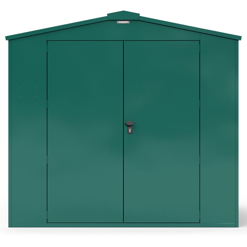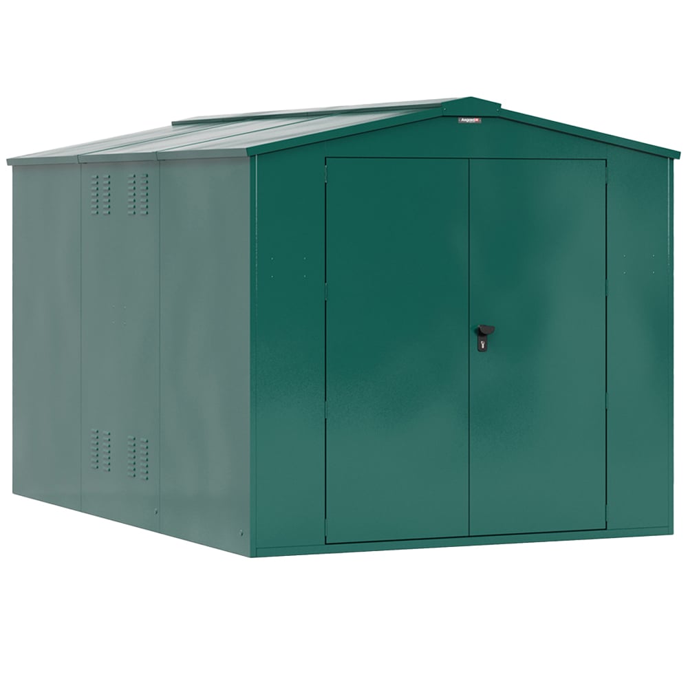 The Asgard Gladiator 10 Bike Storage Shed is a 100% British-made, Secured by Design (Police Preferred Specification), Locksmith Approved and Insurance Approved secure multi-purpose shed, providing exceptionally secure storage for all of your bikes and equipment (up to 10 bikes). Featuring pick and drill resistant locks (with theft resistant – snap off handle), 5-point locking system (including deadbolts), with reinforced doors, stainless steel hinges, and heavy-duty steel panels. Featuring electric socket mounting plates for adding power, this fully approved shed offers superior, professional-level security and is the ideal (one-stop) secure store for all of your tools, bikes, and riding equipment. The Gladiator x 10 cycle garage is constructed from the thick, galvanised (weatherproof) steel panels and features an integral metal floor and convenient large double door access. This fully ventilated bike storage shed has been designed to minimise condensation thanks to the integral ventilation system, helping to maintain internal air flow while remaining secure. Unit comes complete with ramp, wooden subfloor, shelves, hooks, 4 bike racks and electric socket mounting plates. Base size recommended is 2410mm x 3790mm - (Internal Measurements are 1980mm apex / 1820mm eaves x 2600mm d x 2140mm w) - Must sit on concrete, Tarmac or Concrete - hardcore, soil, grass or eco bases NOT suitable. Colour GREEN