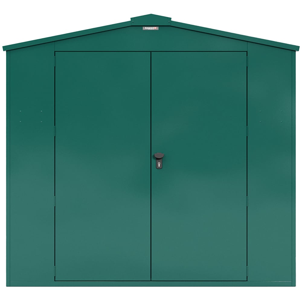 The Asgard Gladiator 7 x 11 Motorcycle Shed is a 100% British-made, Secured by Design (Police Preferred Specification), Locksmith Approved and Insurance Approved, super secure, multi-purpose motorcycle shed and garage. The Gladiator provides exceptionally secure storage for your motorcycle and all your maintenance tools and general equipment in one secure place. Featuring pick and drill resistant locks, 5-point locking system (including deadbolts), with reinforced doors, snap off theft resistant handle, stainless steel hinges, and heavy-duty steel panels, this fully approved shed/garage offers superior, professional, level motorbike security and is the ideal (one-stop) secure store for all of your tools, motorbikes bikes and riding equipment. The Gladiator 7x11 motorcycle garage is constructed from the thick, galvanised (weatherproof) steel panels and features an integral metal floor and convenient large double door access, with electrical mounting plates for adding your own power sockets, perfect for trickle chargers. This fully ventilated storage shed has been designed to minimise condensation thanks to the integral ventilation system, helping to maintain internal air flow, while remaining secure. Unit comes complete with ramp, protective wooden subfloor, shelf, hook rail and electric socket mounting plates. Base size recommended is 2410mm x 3790mm - (Internal Measurements are 1980mm apex / 1820mm eaves x 3222mm d x 2140mm w) - Must sit on concrete, Tarmac or Concrete - hardcore, soil, grass or eco bases NOT suitable. Colour GREEN