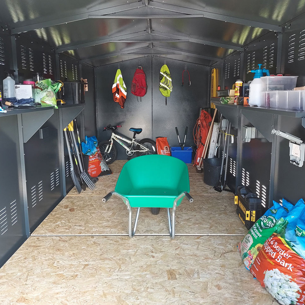 The Asgard Gladiator 7 x 18 Garden Shed is a 100% British-made, Secured by Design (Police Preferred Specification), Locksmith Approved and Insurance Approved secure multi-purpose shed, providing exceptionally secure storage for all of your bikes and garden equipment. This large 7x18 shed features pick and drill resistant locks (with snap-off, theft-resistant handle), a 5-point locking system (including deadbolts), reinforced doors, stainless steel hinges, and heavy-duty steel panels. This fully approved shed offers superior, professional-level security and is the ideal (one-stop) secure store for all tools and garden equipment. The 7 x 18 Gladiator shed is extra wide, to accommodate side-mounted shelves, and is constructed from the thick, galvanised (weatherproof) steel panels and features an integral metal floor and convenient large double door access. Fitted with internal electrical mounting plates (for adding your own power sockets), this heavy-duty shed is ideal for storing and powering up your garden tools all year round. This fully ventilated all-metal storage shed has been designed to minimise condensation thanks to the integral ventilation system, helping to maintain internal air flow, while remaining secure. Helping to keep tools not just safe but also dry. Listing is for the unit only - any accessories shown are for illustration purposes only. Base size recommended is 2410mm x 5876mm - (Internal Measurements are 1980mm apex / 1820mm eaves x 5408mm d x 2140mm w) - Must sit on concrete, Tarmac or Concrete - hardcore, soil, grass or eco bases NOT suitable. Colour IVORY
