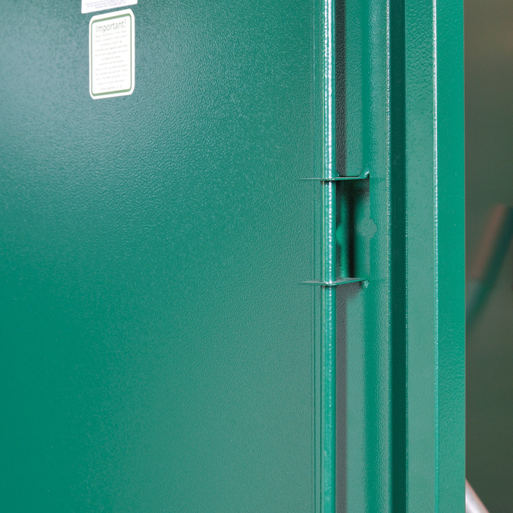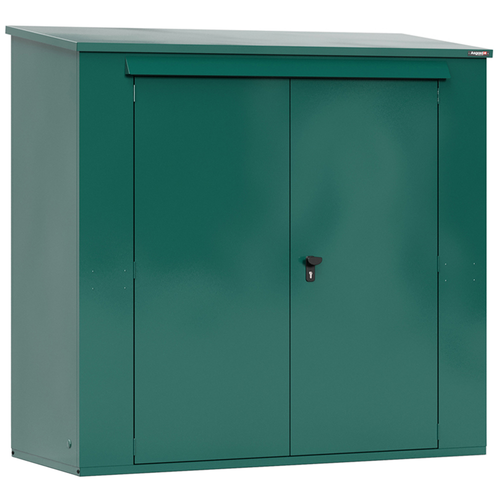 The Trojan Plus shed is a tall, 100% British-made, all-metal secure combi shed. The shed is capable of storing tools and bikes outside of your holiday home or static caravan. The extra width and height give this unit a large capacity, suitable for storing large items such as ladders, rakes, and even bikes. The Trojan is built from the thick, galvanised (weatherproof) steel panels and features an integral metal floor, large double door access and heavy-duty stainless-steel hinges. This all-metal shed offers superior, professional-level security, featuring a pick and drill-resistant (UK Locksmiths approved), 5-point locking system (including deadbolts and anti-thief snap-off handle). This fully ventilated shed has been designed to minimise condensation thanks to the integral ventilation system, helping to maintain internal air flow while remaining locked and secure. Any accessories shown are for illustration purposes only - Listing is for the unit only. -Base size recommended is 2350mm x 1150mm - (Internal Measurements are 2105mm Back / 1995mm Front x 900mm d x 2150mm w) - Must sit on concrete, Tarmac or Concrete - hardcore, soil, grass or eco bases NOT suitable. - Colour GREEN