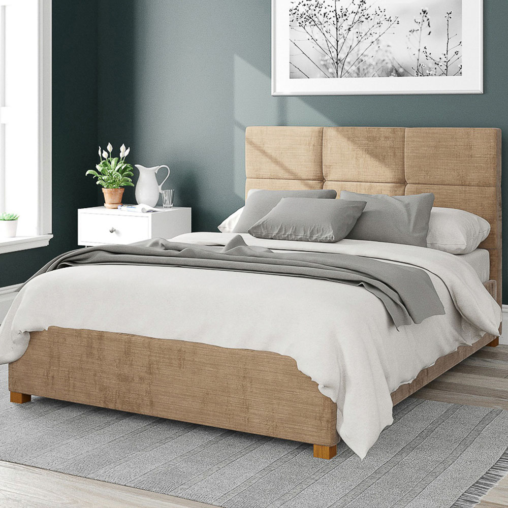 The Caine from Aspire is a high-quality fabric ottoman storage bed handcrafted in the UK. Upholstered in champagne-coloured Firenze velvet fabric to complement a range of contemporary interior decor styles, it ensures exceptional quality and durability with upholstered panels and sprung slats. The sprung slats have been designed to improve comfort and mattress lifespan. The bed frame also features a deep foam-padded headboard, perfect for sitting up in bed while reading. The bed frame not only gives you a great night's sleep but also makes for an elegant centrepiece in any bedroom. What's more, this practical storage bed frame provides perfect storage solutions by offering spacious storage with a dust protection sheet without the need to take up extra floor space! The ottoman bed frame is ideal for rooms with no or limited space as it features a spacious, built-in storage area. The storage area within the bed frame is easily accessible thanks to an easy-lift mechanism supported by gas pistons. Once the storage bed is elevated, it will hold its position, giving you hands-free access to your stored items. Its fabric base has been attached to the underside of the bed to protect your stored items. Plus, the bed is finished with hardwood feet that have been hand-turned and varnished for an added finish. Size: Single.