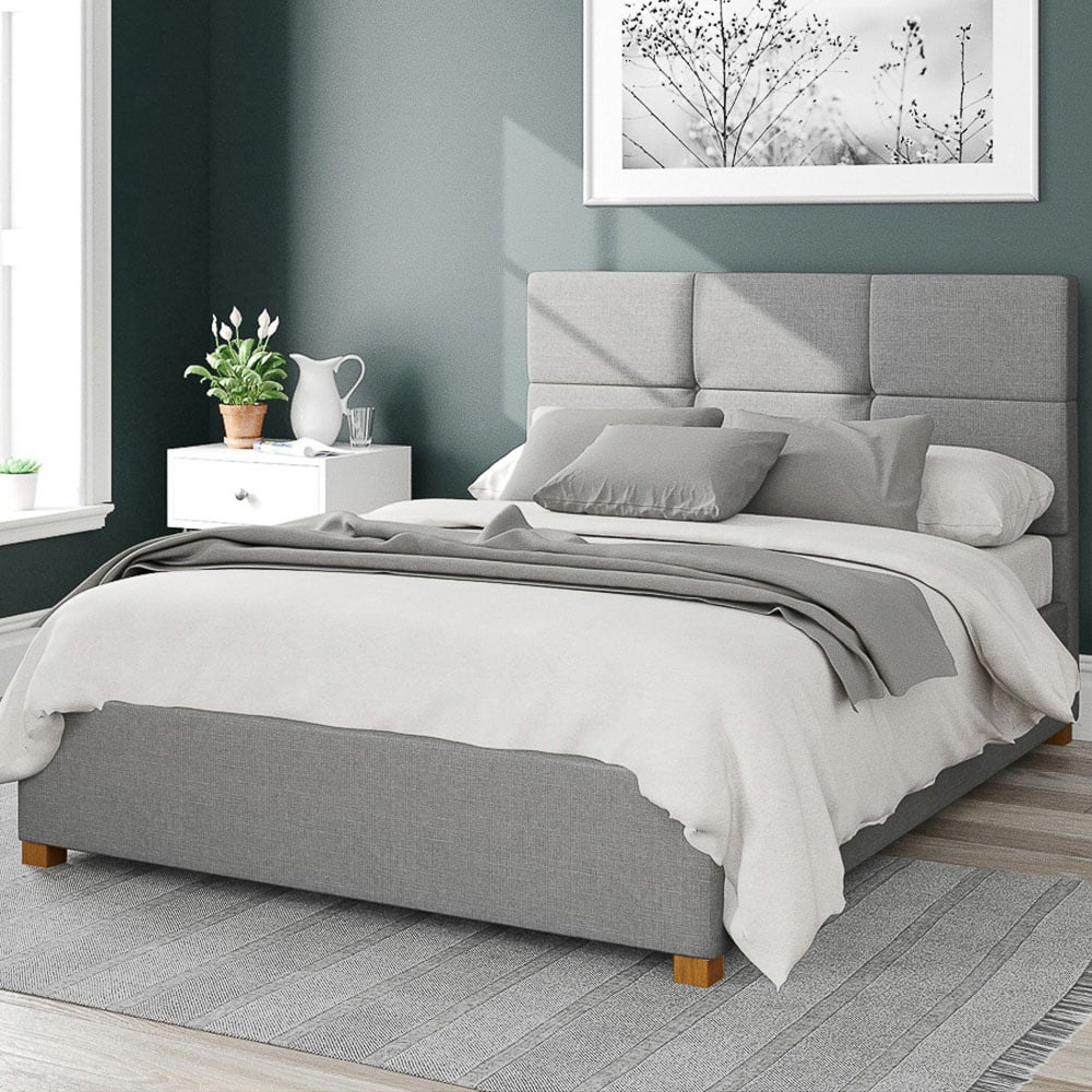 The Caine from Aspire is a high-quality fabric ottoman storage bed handcrafted in the UK. Upholstered in grey-coloured Eire Linen fabric to complement a range of contemporary interior decor styles, it ensures exceptional quality and durability with upholstered panels and sprung slats. The sprung slats have been designed to improve comfort and mattress lifespan. The bed frame also features a deep foam-padded headboard, perfect for sitting up in bed while reading. The bed frame not only gives you a great night's sleep but also makes for an elegant centrepiece in any bedroom. What's more, this practical storage bed frame provides perfect storage solutions by offering spacious storage with a dust protection sheet without the need to take up extra floor space! The ottoman bed frame is ideal for rooms with no or limited space as it features a spacious, built-in storage area. The storage area within the bed frame is easily accessible thanks to an easy-lift mechanism supported by gas pistons. Once the storage bed is elevated, it will hold its position, giving you hands-free access to your stored items. Its fabric base has been attached to the underside of the bed to protect your stored items. Plus, the bed is finished with hardwood feet that have been hand-turned and varnished for an added finish. Size: Small Double.