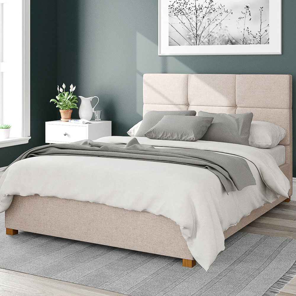The Caine from Aspire is a high-quality fabric ottoman storage bed handcrafted in the UK. Upholstered in grey coloured Saxon twill fabric to complement a range of contemporary interior decor styles, it ensures exceptional quality and durability with upholstered panels and sprung slats. The sprung slats have been designed to improve comfort and mattress lifespan. The bed frame also features a deep foam-padded headboard, perfect for sitting up in bed while reading. The bed frame not only gives you a great night's sleep but also makes for an elegant centrepiece in any bedroom. What's more, this practical storage bed frame provides perfect storage solutions by offering spacious storage with a dust protection sheet without the need to take up extra floor space! The ottoman bed frame is ideal for rooms with no or limited space as it features a spacious, built-in storage area. The storage area within the bed frame is easily accessible thanks to an easy-lift mechanism supported by gas pistons. Once the storage bed is elevated, it will hold its position, giving you hands-free access to your stored items. Its fabric base has been attached to the underside of the bed to protect your stored items. Plus, the bed is finished with hardwood feet that have been hand-turned and varnished for an added finish. Size: Small Double.