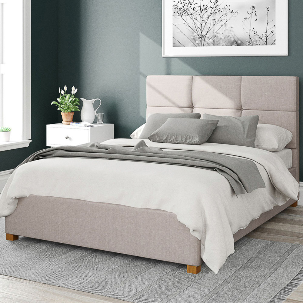 The Caine from Aspire is a high-quality fabric ottoman storage bed handcrafted in the UK. Upholstered in off-white coloured Eire linen fabric to complement a range of contemporary interior decor styles, it ensures exceptional quality and durability with upholstered panels and sprung slats. The sprung slats have been designed to improve comfort and mattress lifespan. The bed frame also features a deep foam-padded headboard, perfect for sitting up in bed while reading. The bed frame not only gives you a great night's sleep but also makes for an elegant centrepiece in any bedroom. What's more, this practical storage bed frame provides perfect storage solutions by offering spacious storage with a dust protection sheet without the need to take up extra floor space! The ottoman bed frame is ideal for rooms with no or limited space as it features a spacious, built-in storage area. The storage area within the bed frame is easily accessible thanks to an easy-lift mechanism supported by gas pistons. Once the storage bed is elevated, it will hold its position, giving you hands-free access to your stored items. Its fabric base has been attached to the underside of the bed to protect your stored items. Plus, the bed is finished with hardwood feet that have been hand-turned and varnished for an added finish. Size: Small Double.