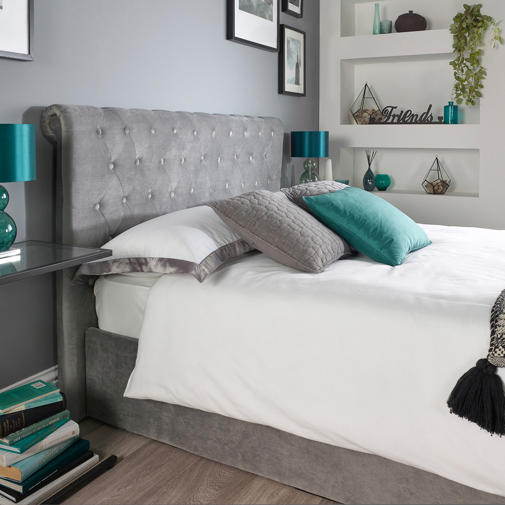 The Aspire Chesterfield Double Grey Ottoman Bed is a stunning storage bed that comes with a scroll top headboard and footboard. Upholstered in grey velvet, this bed has a beautiful finish and features detailed stitching and buttons. The headboard is foam-padded for added comfort while sitting up in bed. With high-quality sprung slats, this bed offers superior support and a ventilation system that improves comfort and mattress lifespan. Not only does the ottoman bed bring style with its elegant scroll top, but it is also a functional piece of furniture with ample storage space within the bed frame. The easy-lift gas pistons support the lift mechanism, allowing for hands-free access to your stored items. Please note that the bed is shipped flat packed and assembly is required.