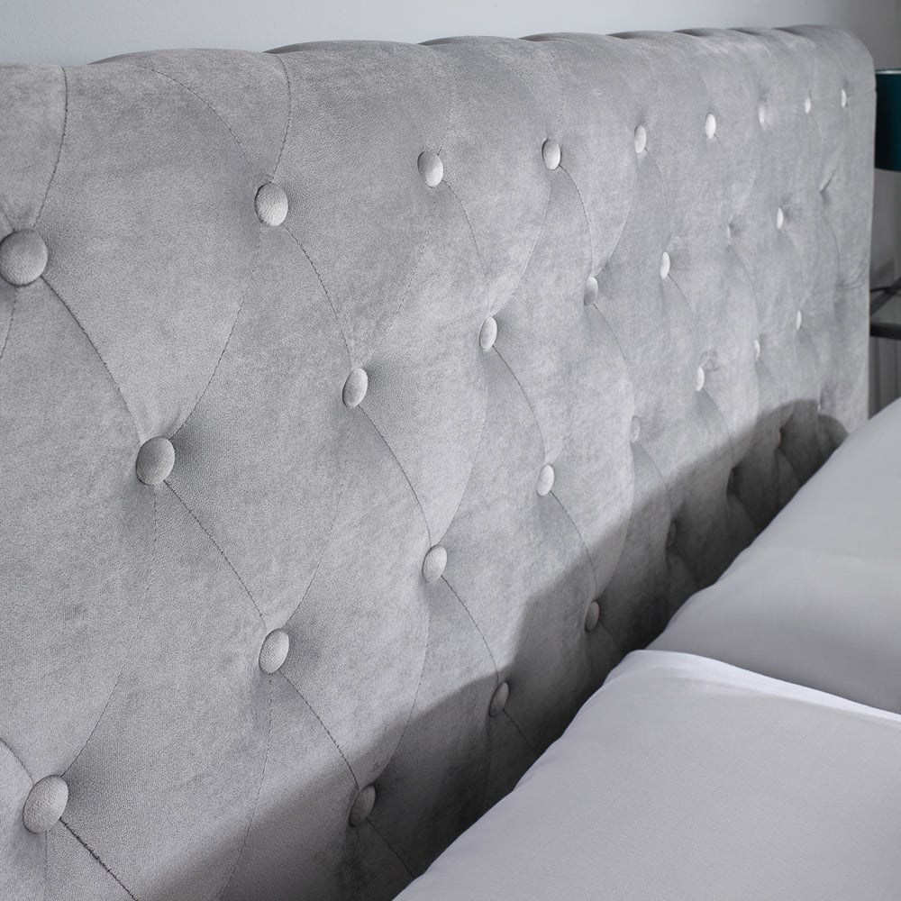 The Aspire Chesterfield King Grey Ottoman Bed is a stunning storage bed that comes with a scroll top headboard and footboard. Upholstered in grey velvet, this bed has a beautiful finish and features detailed stitching and buttons. The headboard is foam-padded for added comfort while sitting up in bed. With high-quality sprung slats, this bed offers superior support and a ventilation system that improves comfort and mattress lifespan. Not only does the ottoman bed bring style with its elegant scroll top, but it is also a functional piece of furniture with ample storage space within the bed frame. The easy-lift gas pistons support the lift mechanism, allowing for hands-free access to your stored items. Please note that the bed is shipped flat packed and assembly is required.
