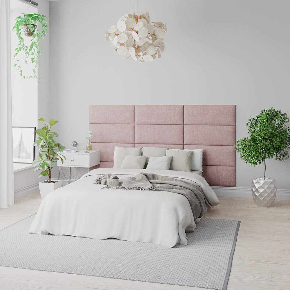 Elevate your decor with the Aspire EasyMount Tea Rose Pure Pastel Cotton Upholstered Wall-Mounted Headboard Panels. This range of wall panels is a fantastic way to instantly transform your bedroom, living room, dining room, or any other reception room in your house or office. With a simple DIY attachment method, these panels can be installed in minutes with no tools required. However, a spirit level is advised to get a neat finish; just peel off the hook and loop fastener backing, place it on your wall, and the super strong pre-attached adhesive does all the heavy lifting. Versatile and stylish, the wall panels are mountable in horizontal or vertical configurations, and the only limit will be the size of your wall. Mounting a few panels behind your bed will give you a traditional headboard without the screws and bolts or fiddley measuring required for traditional wall-mounted models. Also, it will provide a more sturdy alternative to slatted or floor-standing headboards. Simply add more panels to create a truly luxurious feature wall. Plus, they feature a 35mm thick layer of luxurious foam padding to ensure a comfortable feel. Each panel is upholstered by hand by an expert manufacturing team, so you can rest assured you are getting a quality UK-made product. Individual panel dimensions: 762 x 305mm. Pack of eight.