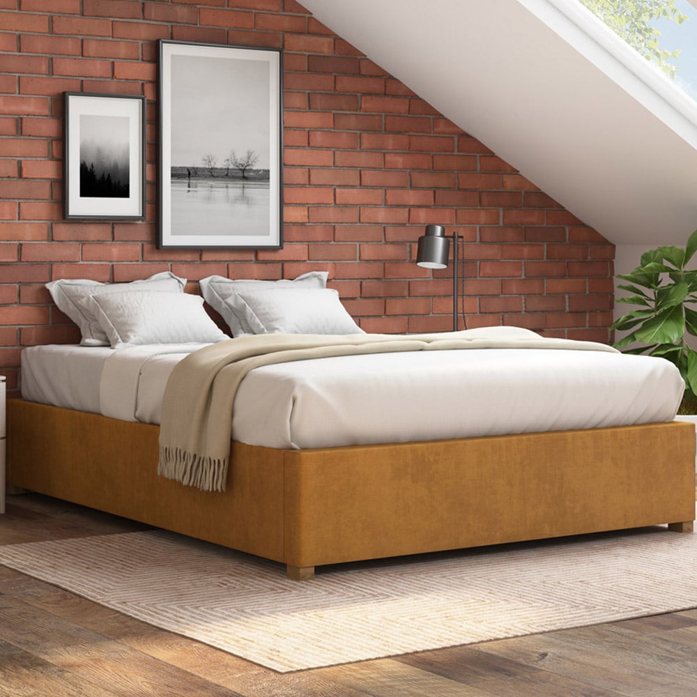Enhance your bedroom decor with the functional and stylish Aspire Furniture Small Double Ochre Plush Platform Ottoman Bed. This handcrafted ottoman storage bed comes with a loft-style low headboard design. It provides lasting comfort and a striking focal point for any bedroom. The ample storage space makes this bed a lifesaver for smaller bedrooms or houses with limited storage. The platform ottoman bed features chunky upholstered panels for long-lasting durability. It also uses quality sprung slats to make the bed, which improves comfort and mattress lifespan. The bed uses high-quality gas pistons to support the ottoman mechanism. Once the bed's top is elevated, it will hold its position. This allows for easy, hands-free access to your stored items. The mechanism can lift a mattress weighing up to 60kg. The items will be protected by a fabric base attached to the underside of the bed. It also has a headboard less design, meaning it will look great with any of the wall-mounted headboard panel options or used alongside freestanding oversized wing headboard. It is finished with hand-turned, hardwood feet and handcrafted in the UK.