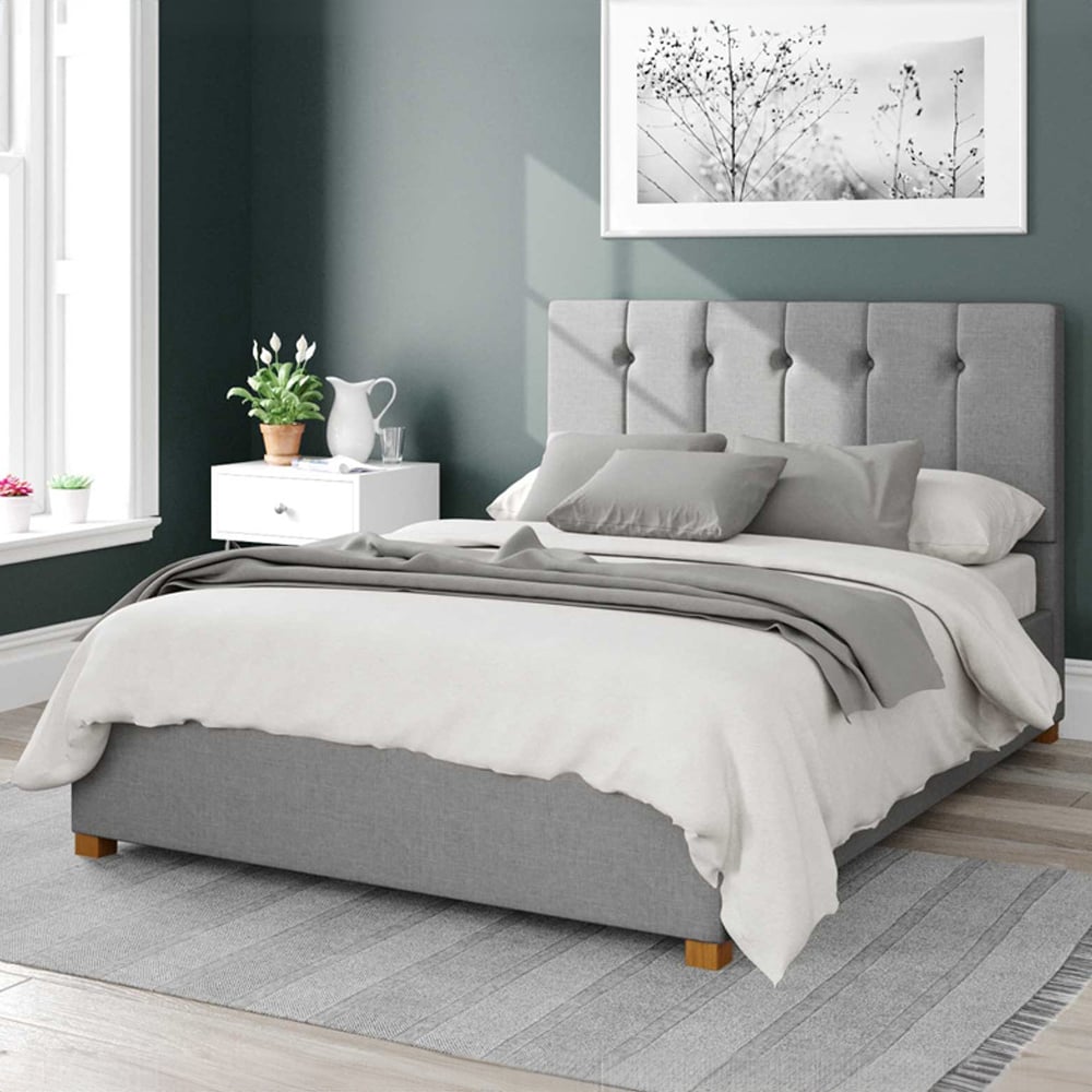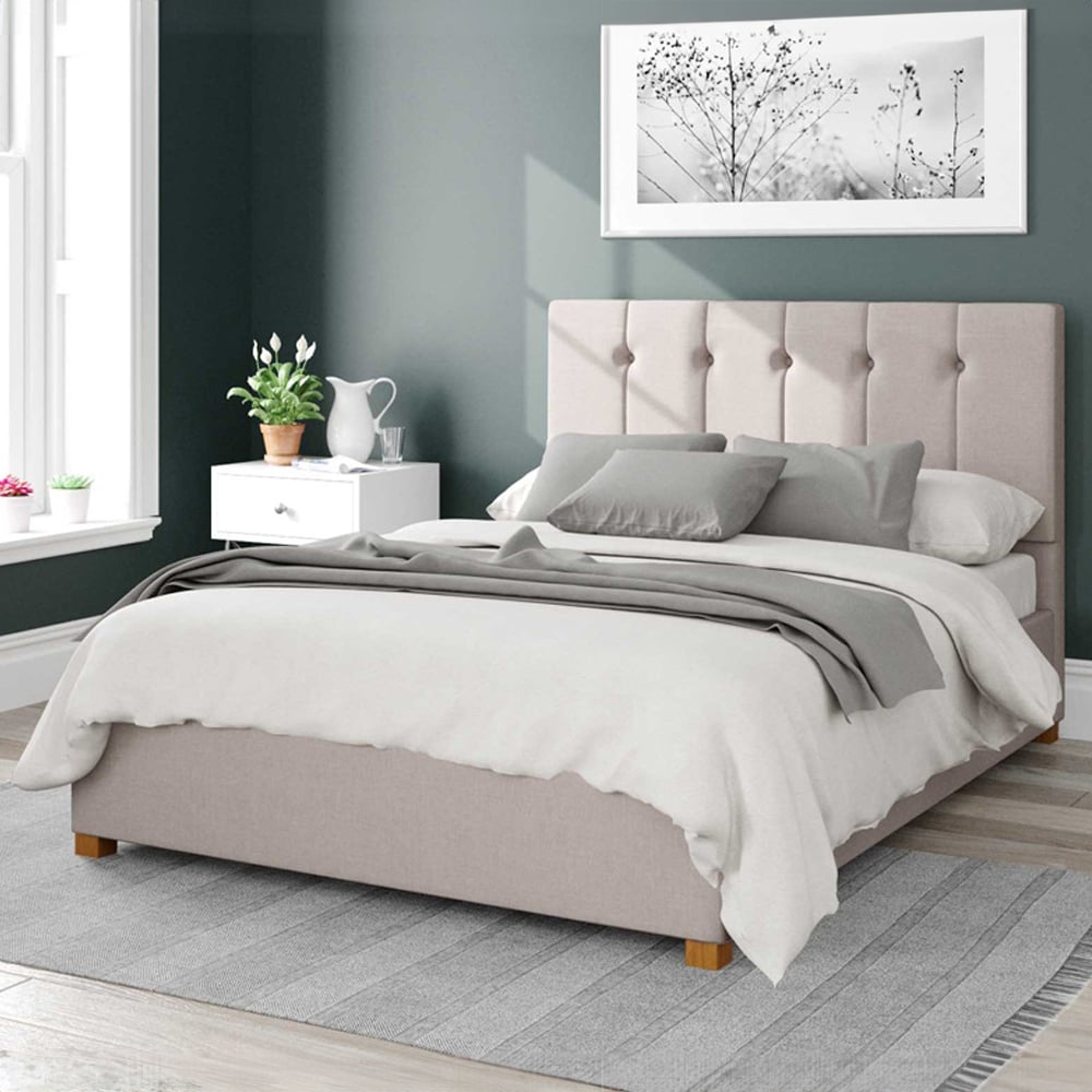 Enjoy a clutter-free bedroom space with this Aspire Hepburn Double Off White Eire Linen Ottoman Bed. This stylish bed ensures quality and has no shortcuts in the making; therefore, it is designed and handcrafted down to the last stitch. The frame is crafted using chunky, upholstered panels that will endure the test of time. Also, the excellent sprung slats with a multi-layer construction ensure durability and comfort. Made with elegance, the bed is finished with hand-carved, hardwood feet and comes with a tasteful, upholstered headboard. The headboard features a deep padding for no compromises in comfort while sitting in bed. Plus, the fabric buttons and vertical line design create a clean and sophisticated look. Ideal for both contemporary and traditional interior decor, this bed is perfect for a range of interiors. For added convenience, it also provides a solution to your storage problems. This ottoman bed reveals a spacious storage area underneath, meaning you can store items within the bed frame without taking up extra floor space. To protect items stored and ensure that they are not in contact with the floor, it comes with an attached fabric base to the underside of the bed. Easy to use, the simple-lift mechanism powered by gas pistons enables access to the storage with minimal effort. Sturdy and solid, this bed is capable of lifting a mattress with a weight of up to 60kg. Moreover, the pistons hold the bed in place when it is raised for hands-free access. This ottoman bed frame is manufactured in the UK.