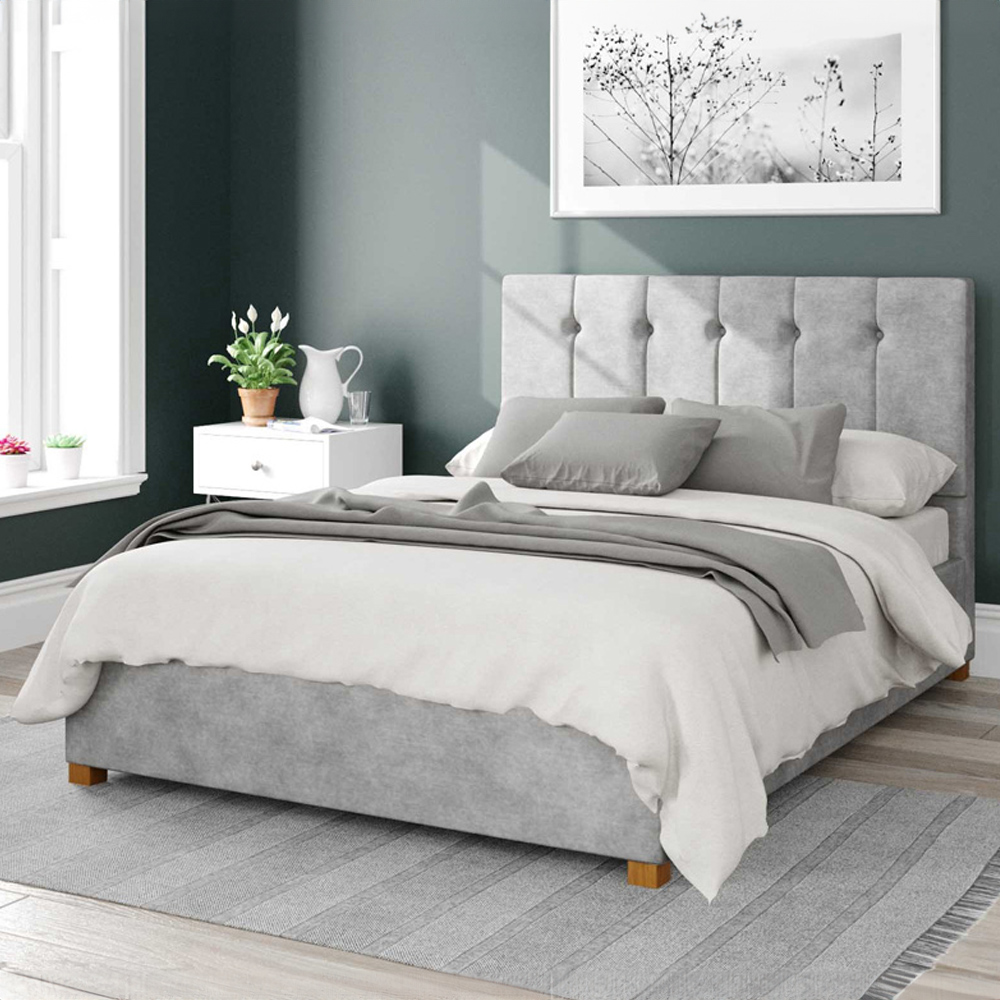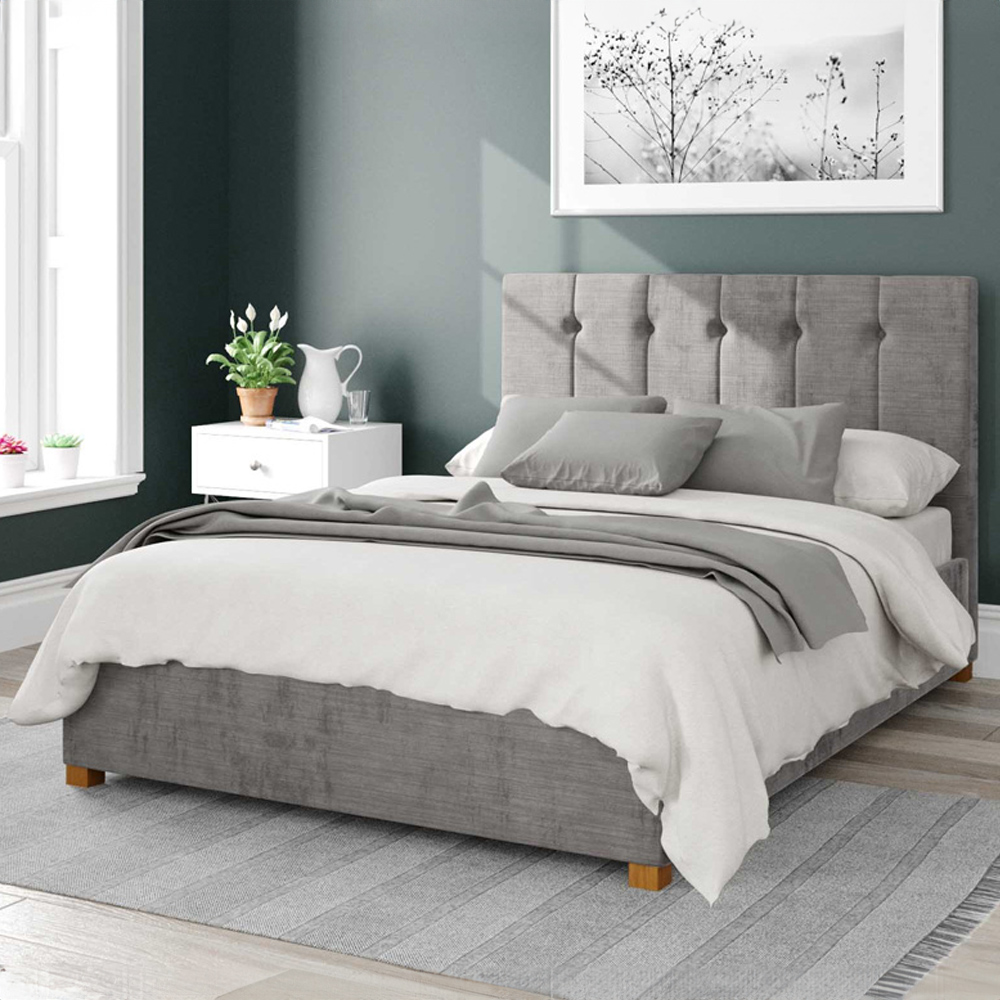 Add functionality and comfort to your bedroom with this Aspire Hepburn Double Silver Kimiyo Linen Ottoman Bed. This stylish bed ensures quality and has no shortcuts in the making; therefore, it is designed and handcrafted down to the last stitch. The frame is crafted using chunky, upholstered panels that will endure the test of time. Also, the excellent sprung slats with a multi-layer construction ensure durability and comfort. Made with elegance, the bed is finished with hand-carved, hardwood feet and comes with a tasteful, upholstered headboard. The headboard features a deep padding for no compromises in comfort while sitting in bed. Plus, the fabric buttons and vertical line design create a clean and sophisticated look. Ideal for both contemporary and traditional interior decor, this bed is perfect for a range of interiors. For added convenience, it also provides a solution to your storage problems. This ottoman bed reveals a spacious storage area underneath, meaning you can store items within the bed frame without taking up extra floor space. To protect items stored and ensure that they are not in contact with the floor, it comes with an attached fabric base to the underside of the bed. Easy to use, the simple-lift mechanism powered by gas pistons enables access to the storage with minimal effort. Sturdy and solid, this bed is capable of lifting a mattress with a weight of up to 60kg. Moreover, the pistons hold the bed in place when it is raised for hands-free access. This ottoman bed frame is manufactured in the UK.