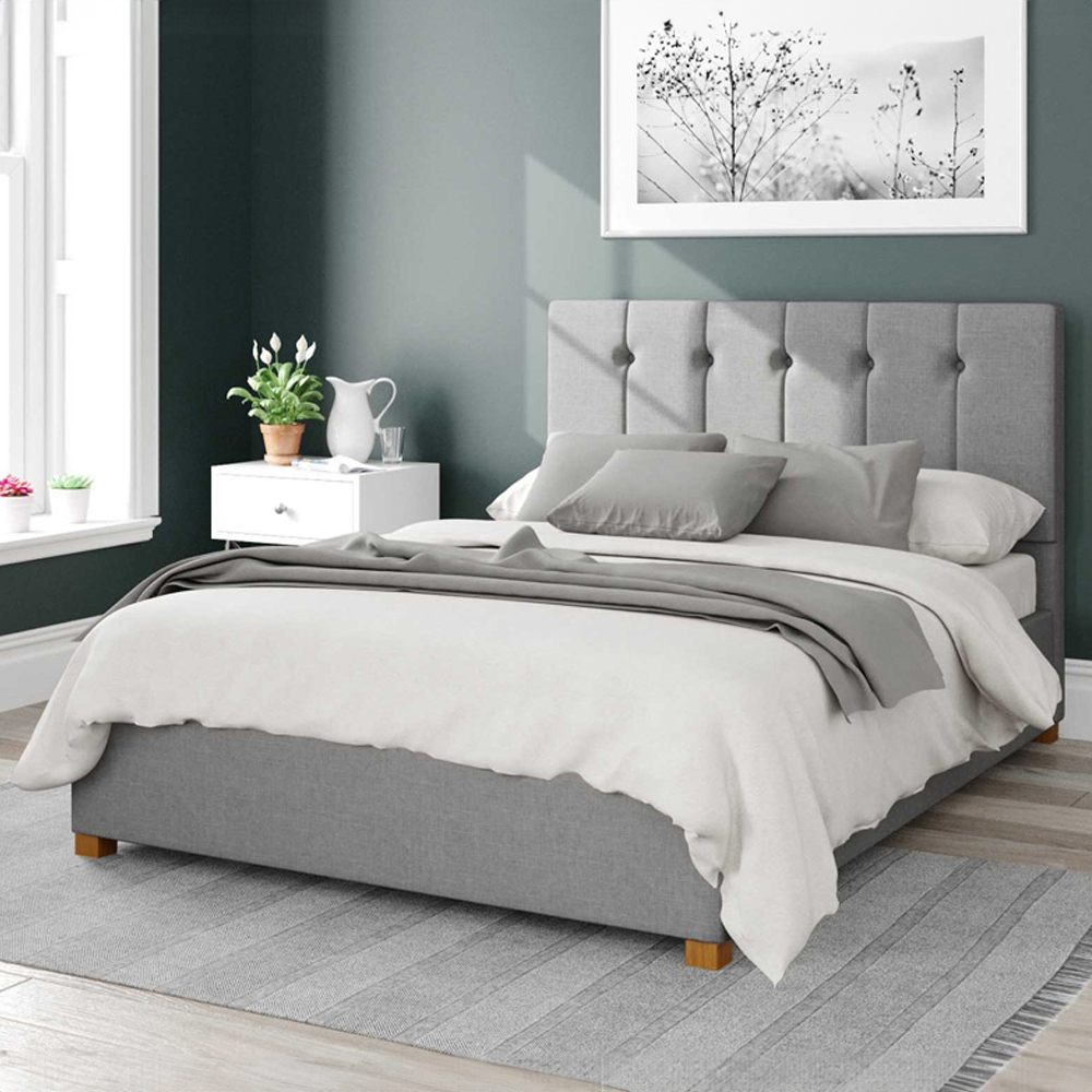 Discover the perfect blend of style and functionality with this Aspire Hepburn King Size Grey Saxon Twill Ottoman Bed. This stylish bed ensures quality and has no shortcuts in the making; therefore, it is designed and handcrafted down to the last stitch. The frame is crafted using chunky, upholstered panels that will endure the test of time. Also, the excellent sprung slats with a multi-layer construction ensure durability and comfort. Made with elegance, the bed is finished with hand-carved, hardwood feet and comes with a tasteful, upholstered headboard. The headboard features a deep padding for no compromises in comfort while sitting in bed. Plus, the fabric buttons and vertical line design create a clean and sophisticated look. Ideal for both contemporary and traditional interior decor, this bed is perfect for a range of interiors. For added convenience, it also provides a solution to your storage problems. This ottoman bed reveals a spacious storage area underneath, meaning you can store items within the bed frame without taking up extra floor space. To protect items stored and ensure that they are not in contact with the floor, it comes with an attached fabric base to the underside of the bed. Easy to use, the simple-lift mechanism powered by gas pistons enables access to the storage with minimal effort. Sturdy and solid, this bed is capable of lifting a mattress with a weight of up to 60kg. Moreover, the pistons hold the bed in place when it is raised for hands-free access. This ottoman bed frame is manufactured in the UK.