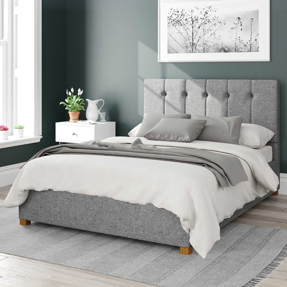 Discover the perfect blend of style and functionality with this Aspire Hepburn King Size Natural Saxon Twill Ottoman Bed. This stylish bed ensures quality and has no shortcuts in the making; therefore, it is designed and handcrafted down to the last stitch. The frame is crafted using chunky, upholstered panels that will endure the test of time. Also, the excellent sprung slats with a multi-layer construction ensure durability and comfort. Made with elegance, the bed is finished with hand-carved, hardwood feet and comes with a tasteful, upholstered headboard. The headboard features a deep padding for no compromises in comfort while sitting in bed. Plus, the fabric buttons and vertical line design create a clean and sophisticated look. Ideal for both contemporary and traditional interior decor, this bed is perfect for a range of interiors. For added convenience, it also provides a solution to your storage problems. This ottoman bed reveals a spacious storage area underneath, meaning you can store items within the bed frame without taking up extra floor space. To protect items stored and ensure that they are not in contact with the floor, it comes with an attached fabric base to the underside of the bed. Easy to use, the simple-lift mechanism powered by gas pistons enables access to the storage with minimal effort. Sturdy and solid, this bed is capable of lifting a mattress with a weight of up to 60kg. Moreover, the pistons hold the bed in place when it is raised for hands-free access. This ottoman bed frame is manufactured in the UK.