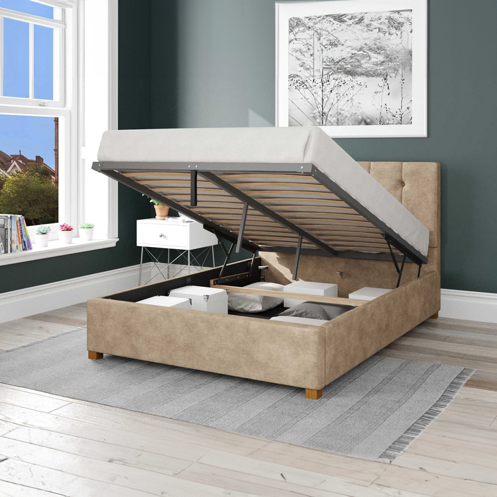 Add functionality and comfort to your bedroom with this Aspire Hepburn Single Beige Kimiyo Linen Ottoman Bed. This stylish bed ensures quality and has no shortcuts in the making; therefore, it is designed and handcrafted down to the last stitch. The frame is crafted using chunky, upholstered panels that will endure the test of time. Also, the excellent sprung slats with a multi-layer construction ensure durability and comfort. Made with elegance, the bed is finished with hand-carved, hardwood feet and comes with a tasteful, upholstered headboard. The headboard features a deep padding for no compromises in comfort while sitting in bed. Plus, the fabric buttons and vertical line design create a clean and sophisticated look. Ideal for both contemporary and traditional interior decor, this bed is perfect for a range of interiors. For added convenience, it also provides a solution to your storage problems. This ottoman bed reveals a spacious storage area underneath, meaning you can store items within the bed frame without taking up extra floor space. To protect items stored and ensure that they are not in contact with the floor, it comes with an attached fabric base to the underside of the bed. Easy to use, the simple-lift mechanism powered by gas pistons enables access to the storage with minimal effort. Sturdy and solid, this bed is capable of lifting a mattress with a weight of up to 60kg. Moreover, the pistons hold the bed in place when it is raised for hands-free access. This ottoman bed frame is manufactured in the UK.
