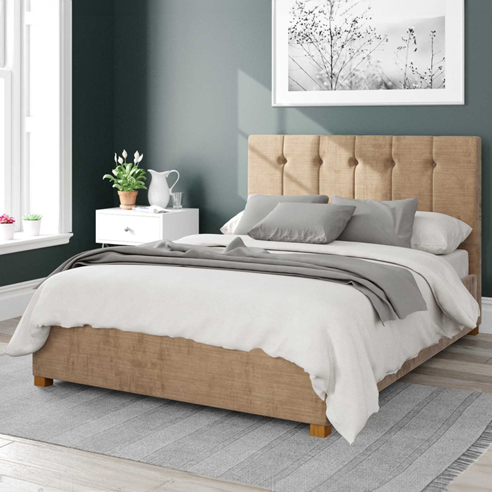 Upgrade your sleep haven with this Aspire Hepburn Single Champagne Firenze Velour Ottoman Bed. This stylish bed ensures quality and has no shortcuts in the making; therefore, it is designed and handcrafted down to the last stitch. The frame is crafted using chunky, upholstered panels that will endure the test of time. Also, the excellent sprung slats with a multi-layer construction ensure durability and comfort. Made with elegance, the bed is finished with hand-carved, hardwood feet and comes with a tasteful, upholstered headboard. The headboard features a deep padding for no compromises in comfort while sitting in bed. Plus, the fabric buttons and vertical line design create a clean and sophisticated look. Ideal for both contemporary and traditional interior decor, this bed is perfect for a range of interiors. For added convenience, it also provides a solution to your storage problems. This ottoman bed reveals a spacious storage area underneath, meaning you can store items within the bed frame without taking up extra floor space. To protect items stored and ensure that they are not in contact with the floor, it comes with an attached fabric base to the underside of the bed. Easy to use, the simple-lift mechanism powered by gas pistons enables access to the storage with minimal effort. Sturdy and solid, this bed is capable of lifting a mattress with a weight of up to 60kg. Moreover, the pistons hold the bed in place when it is raised for hands-free access. This ottoman bed frame is manufactured in the UK.