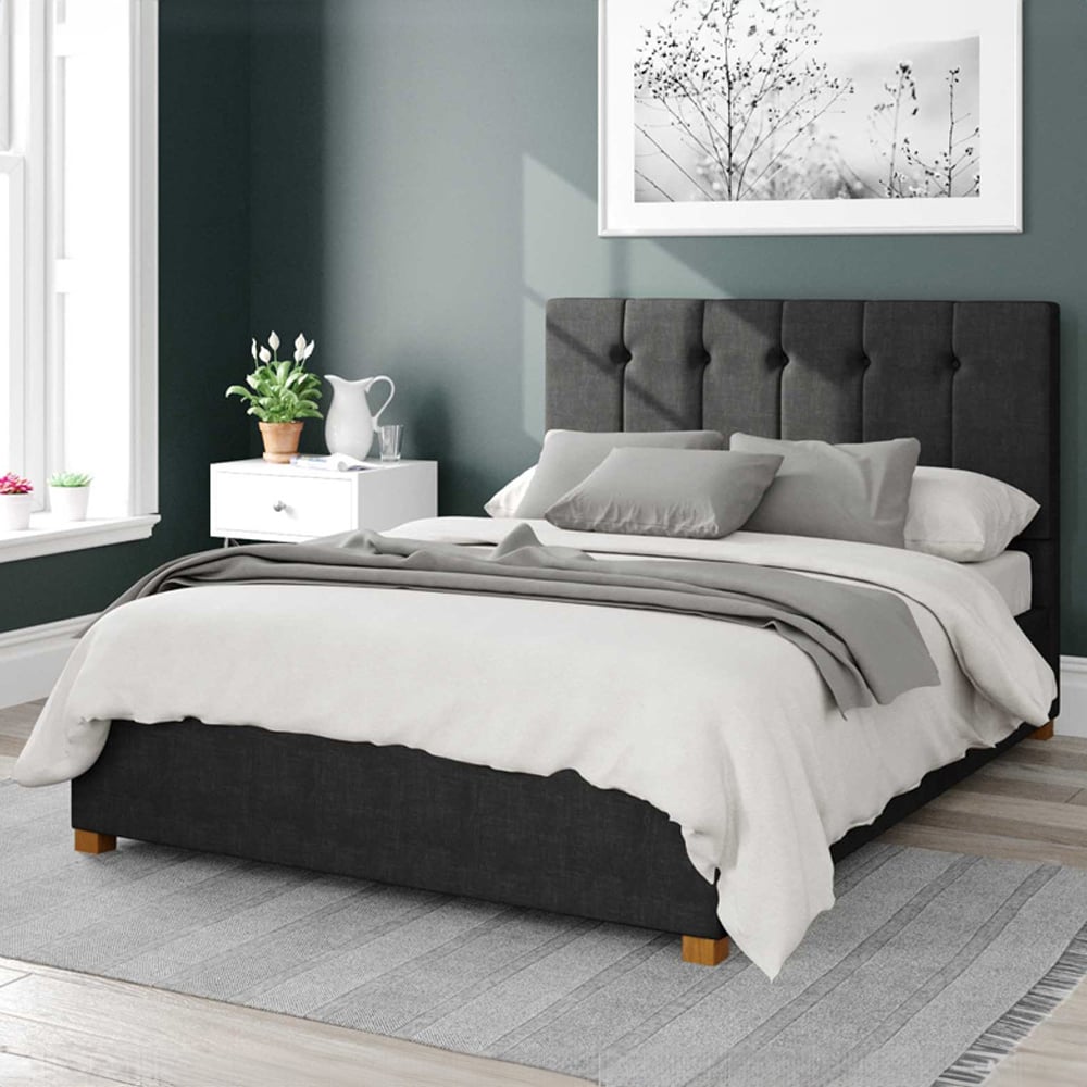Say goodbye to clutter and introduce elegance to your space with this Aspire Hepburn Single Ebony Malham Weave Ottoman Bed. This stylish bed ensures quality and has no shortcuts in the making; therefore, it is designed and handcrafted down to the last stitch. The frame is crafted using chunky, upholstered panels that will endure the test of time. Also, the excellent sprung slats with a multi-layer construction ensure durability and comfort. Made with elegance, the bed is finished with hand-carved, hardwood feet and comes with a tasteful, upholstered headboard. The headboard features a deep padding for no compromises in comfort while sitting in bed. Plus, the fabric buttons and vertical line design create a clean and sophisticated look. Ideal for both contemporary and traditional interior decor, this bed is perfect for a range of interiors. For added convenience, it also provides a solution to your storage problems. This ottoman bed reveals a spacious storage area underneath, meaning you can store items within the bed frame without taking up extra floor space. To protect items stored and ensure that they are not in contact with the floor, it comes with an attached fabric base to the underside of the bed. Easy to use, the simple-lift mechanism powered by gas pistons enables access to the storage with minimal effort. Sturdy and solid, this bed is capable of lifting a mattress with a weight of up to 60kg. Moreover, the pistons hold the bed in place when it is raised for hands-free access. This ottoman bed frame is manufactured in the UK.