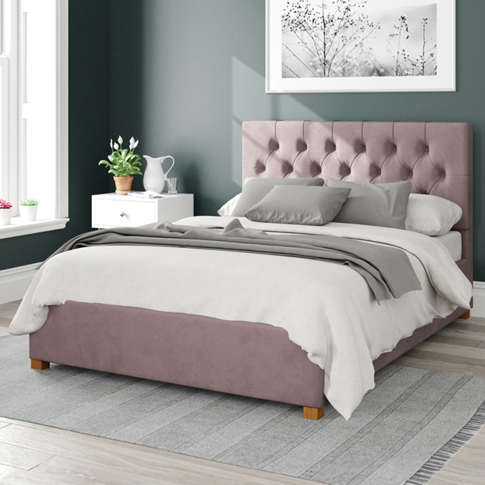 Experience the perfect blend of luxury and comfort with the Aspire Olivier Double Blush Plush Velvet Ottoman Bed. This upholstered storage bed comes with a stylish headboard and has been expertly designed and handcrafted in the UK to last for years to come. The sturdy, upholstered panels and quality sprung slats ensure durability and enhanced mattress lifespan and comfort. The spacious storage area beneath the bed, accessible through an easy-lift mechanism supported by gas pistons, is perfect for storing extra linens, pillows, and blankets. Plus, the fabric base keeps your stored items protected. The bed features a timeless, upholstered headboard that is Chesterfield-inspired, hand-tufted, and handmade down to the last stitch. The thick wooden panel and deep foam padding of the headboard provide maximum comfort when sitting up in bed. The bed is finished with hardwood feet that have been hand-turned and varnished.