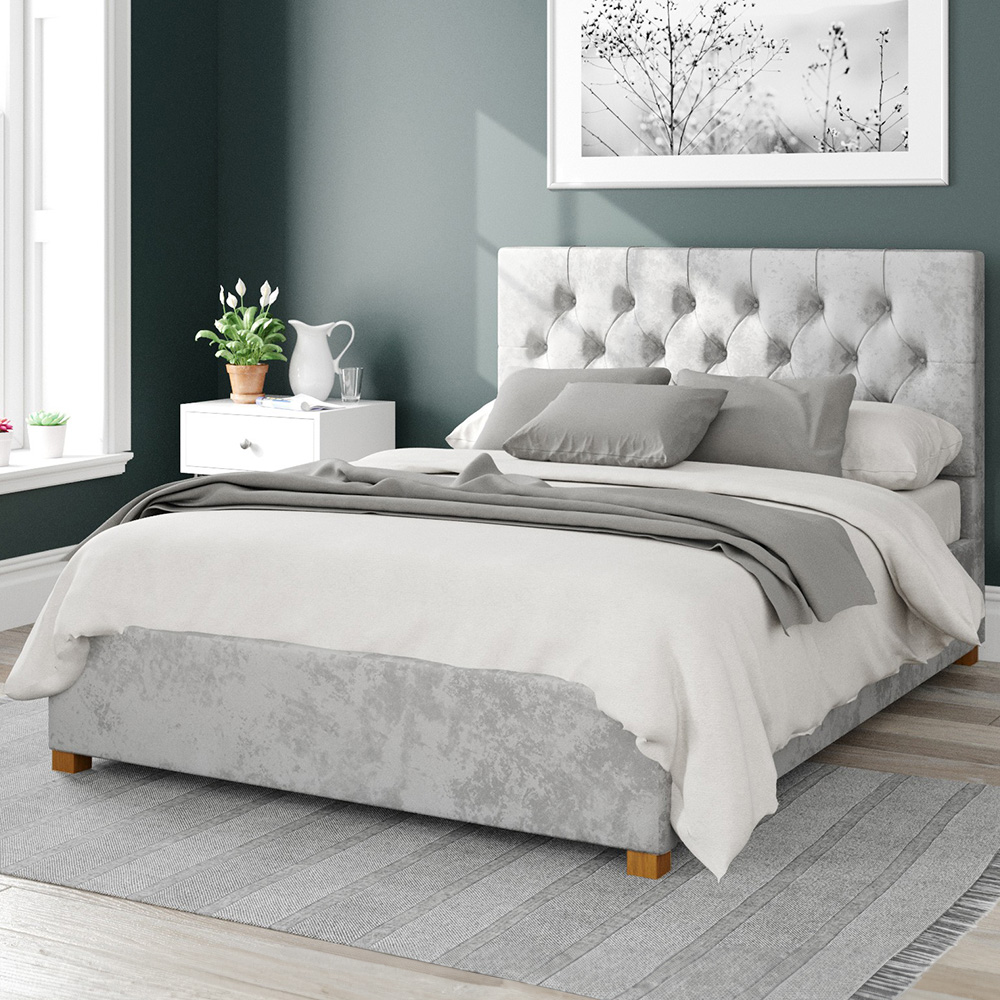 Experience the perfect blend of luxury and comfort with the Aspire Olivier Small Double Silver Mirazzi Velvet Ottoman Bed. This upholstered storage bed comes with a stylish headboard and has been expertly designed and handcrafted in the UK to last for years to come. The sturdy, upholstered panels and quality sprung slats ensure durability and enhanced mattress lifespan and comfort. The spacious storage area beneath the bed, accessible through an easy-lift mechanism supported by gas pistons, is perfect for storing extra linens, pillows, and blankets. Plus, the fabric base keeps your stored items protected. The bed features a timeless, upholstered headboard that is Chesterfield-inspired, hand-tufted, and handmade down to the last stitch. The thick wooden panel and deep foam padding of the headboard provide maximum comfort when sitting up in bed. The bed is finished with hardwood feet that have been hand-turned and varnished.