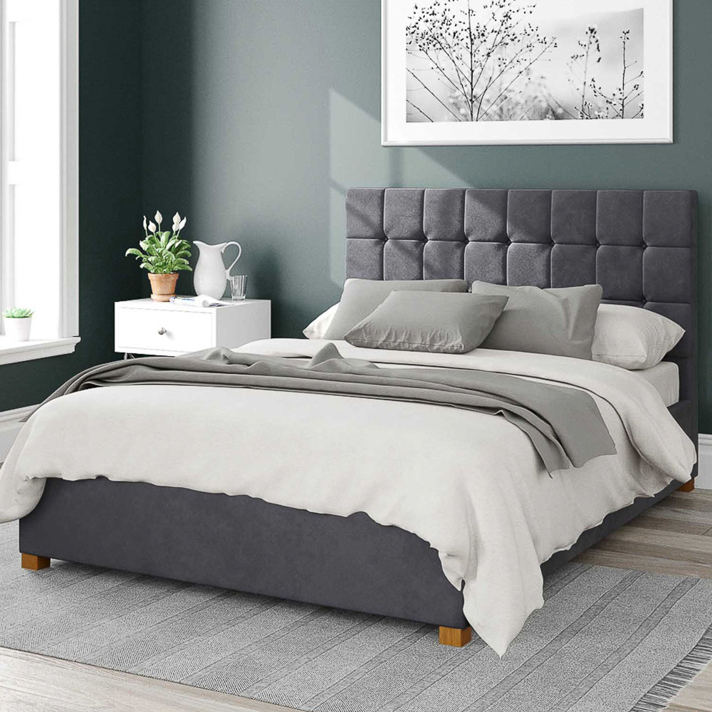 Discover the ultimate haven of relaxation and style with this Aspire Sinatra Single Steel Plush Velvet Ottoman Bed, a high-quality, upholstered storage bed handmade in the UK. Made from sturdy, upholstered panels that have been built to last, the bed frame features quality sprung slats that improve mattress lifespan and comfort. Finished with hand-turned and varnished hardwood feet, the bed has a stylish headboard and a contemporary squared design with classic buttoning. The deep foam padding of the fabric headboard ensures comfort as you sit in bed. It also provides ample storage space with an easy-lift mechanism and gas pistons that enable the storage space to be accessed with minimal effort. The bed will hold its elevated position once lifted, granting hands-free access to the storage. For the protection of your stored items, the bed is attached with a fabric base to the underside of the bed so they are not sitting directly on the floor.