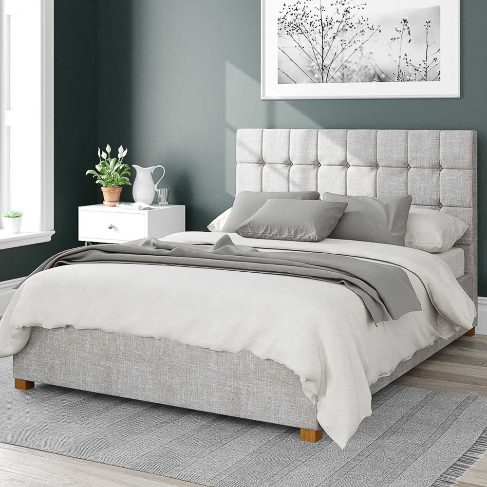 Discover the ultimate haven of relaxation and style with this Aspire Sinatra Small Double Storm Pure Pastel Cotton Ottoman Bed, a high-quality, upholstered storage bed handmade in the UK. Made from sturdy, upholstered panels that have been built to last, the bed frame features quality sprung slats that improve mattress lifespan and comfort. Finished with hand-turned and varnished hardwood feet, the bed has a stylish headboard and a contemporary squared design with classic buttoning. The deep foam padding of the fabric headboard ensures comfort as you sit in bed. It also provides ample storage space with an easy-lift mechanism and gas pistons that enable the storage space to be accessed with minimal effort. The bed will hold its elevated position once lifted, granting hands-free access to the storage. For the protection of your stored items, the bed is attached with a fabric base to the underside of the bed so they are not sitting directly on the floor.