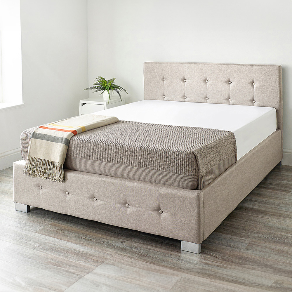 The Aspire Small Double End Lift Ottoman Storage Bed in beige linen colour is a stylish and practical choice for your bedroom. Made with high-quality linen fabric, this bed offers both storage solutions and a comfortable sleep experience at an affordable price. The bed features a durable steel framework and eight-ply poplar-sprung slats, designed to enhance comfort and prolong the lifespan of your mattress. The storage area within the bed frame is easily accessible thanks to gas lift pistons, allowing you to store your items with ease. The base of the bed is covered with black fabric cloth, ensuring that your stored items are not in contact with the floor. With its classic buttoned headboard and matching footboard, the bed exudes elegance. The padded headboard adds extra comfort when sitting up in bed. It is not only hard-wearing but also easy to clean. To complete the look, the bed is equipped with attractive silver feet. It is suitable for use with all standard UK size mattresses. The bed is supplied flat-packed for self-assembly, with an estimated build time of 60 to 90 minutes. Rest assured, the ottoman storage bed meets all UK FR (Fire Retardant) and safety standards, and has undergone extensive structural testing.