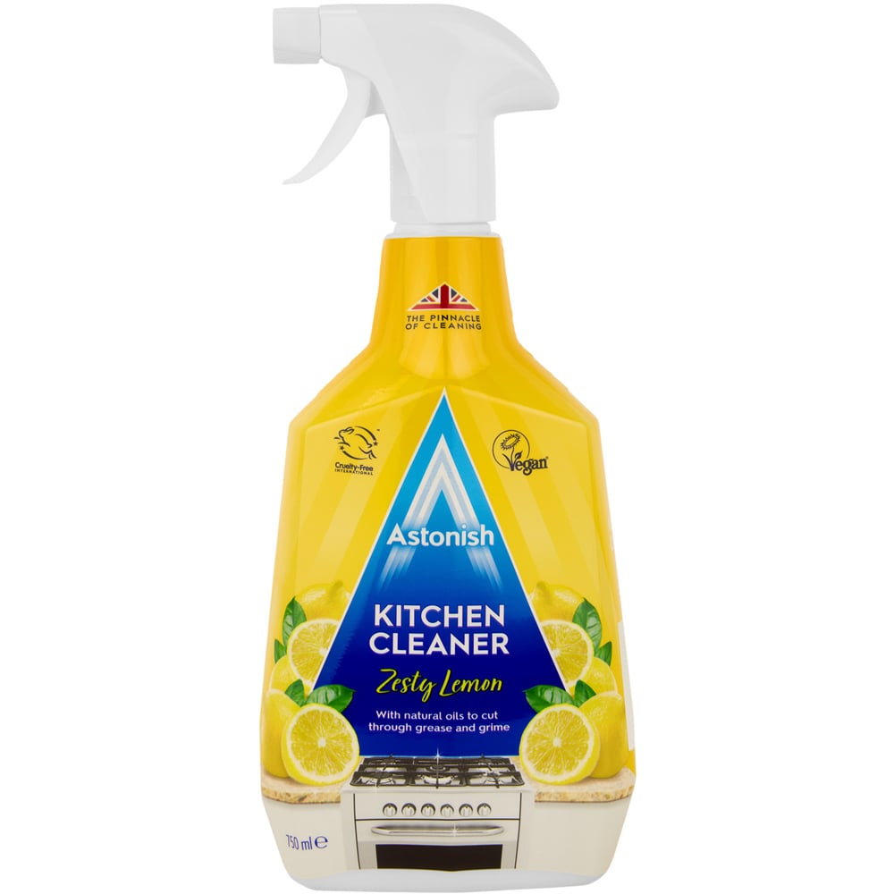 Maintain a shiny and grime-free kitchen with Astonish Zesty Lemon Kitchen Cleaner Spray 750ml. This spray effortlessly tackles grease and dirt, simplifying your everyday kitchen cleaning chores. With its refreshing lemon scent, your kitchen will also smell delightful. It can be used on kitchen cabinets, countertops, tiles, and any area where grease tends to accumulate. Suitable for vegans, this product is produced in the United Kingdom. You can apply this kitchen cleaner with a damp cloth or sponge. To use, simply spray the cleaner onto the surface that needs attention and wipe it away. For tough grease and stains, spray the cleaner and let it sit for two minutes before wiping it off. Please be aware that this product should not be used on unsealed wood, porous surfaces, or unglazed tiles. Avoid letting the cleaning solution stay in contact with paint, gold finishes, and lacquered or varnished wood for extended periods.