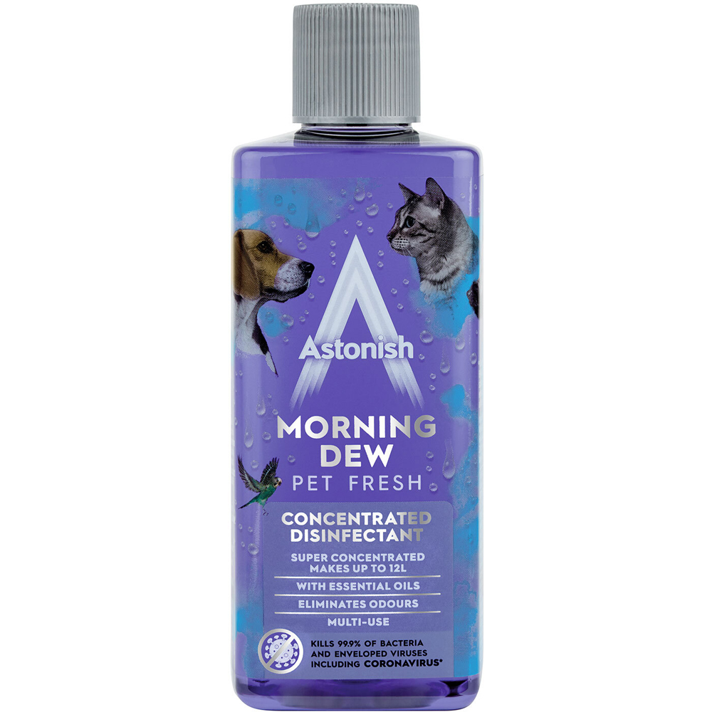 Create a strong cleaning solution using the Astonish Morning Dew Concentrated Disinfectant Pet Fresh 300ml. Capable of eliminating up to 99.9% of bacteria, this disinfectant is perfect for refreshing your floors, removing odours from bins, sanitizing cloths, and cleaning your refrigerator. It incorporates a mix of essential oils to provide a lasting, delightful aroma for your home.